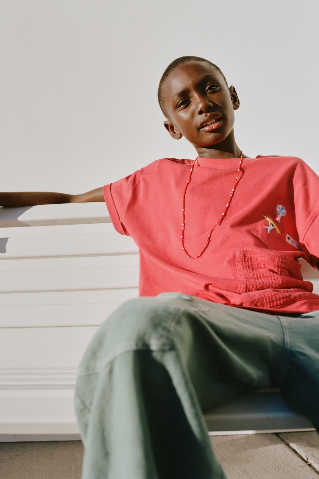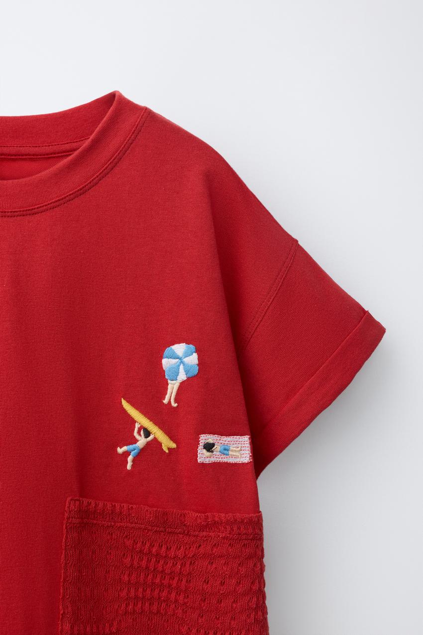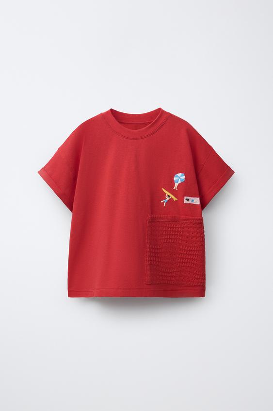 ZARА ФУТБОЛКА С КАРМАНОМ ИЗ КРУЖЕВА КРОШЕ, КРАСНЫЙ