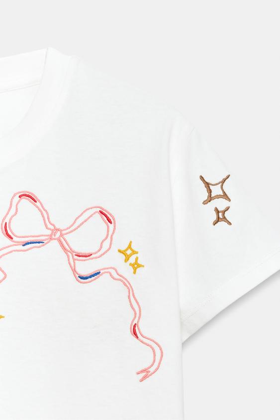 ZARA ФУТБОЛКА С КОНТРАСТНОЙ ВЫШИВКОЙ, ЖЕЛТОВАТО-БЕЛЫЙ
