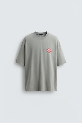 ZARA ФУТБОЛКА С КОНТРАСТНЫМ ПРИНТОМ И ЭФФЕКТОМ ПОТЕРТОСТИ, ТЕМНО-СЕРЫЙ