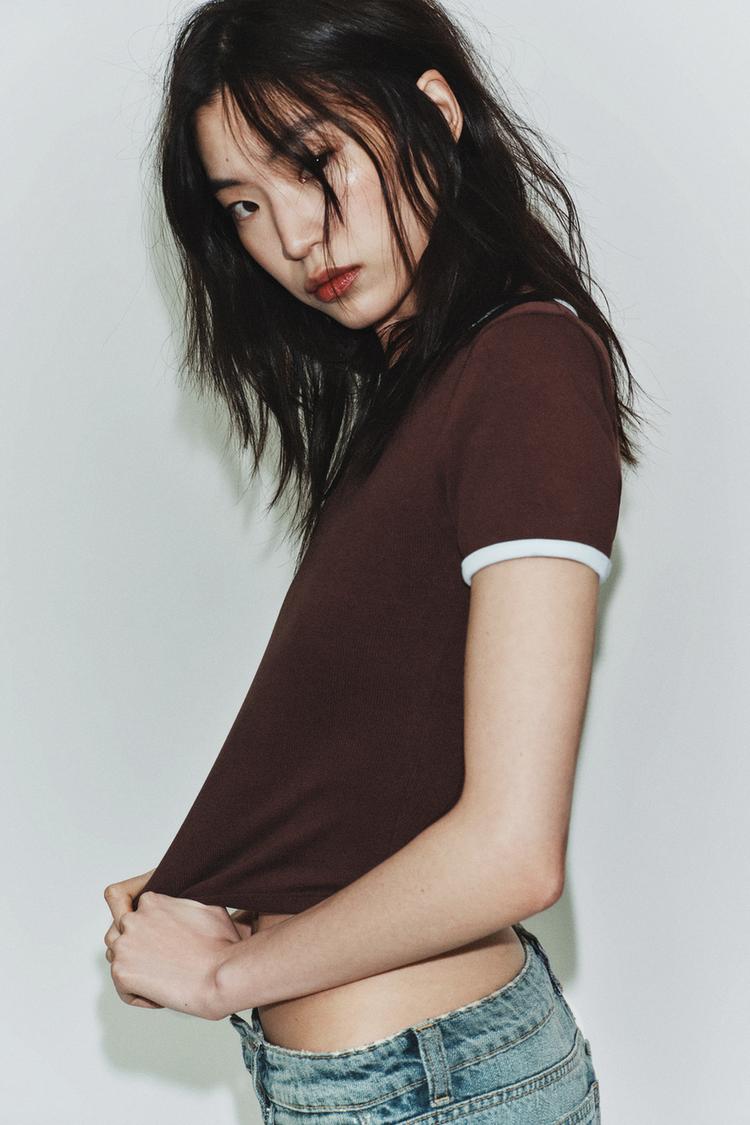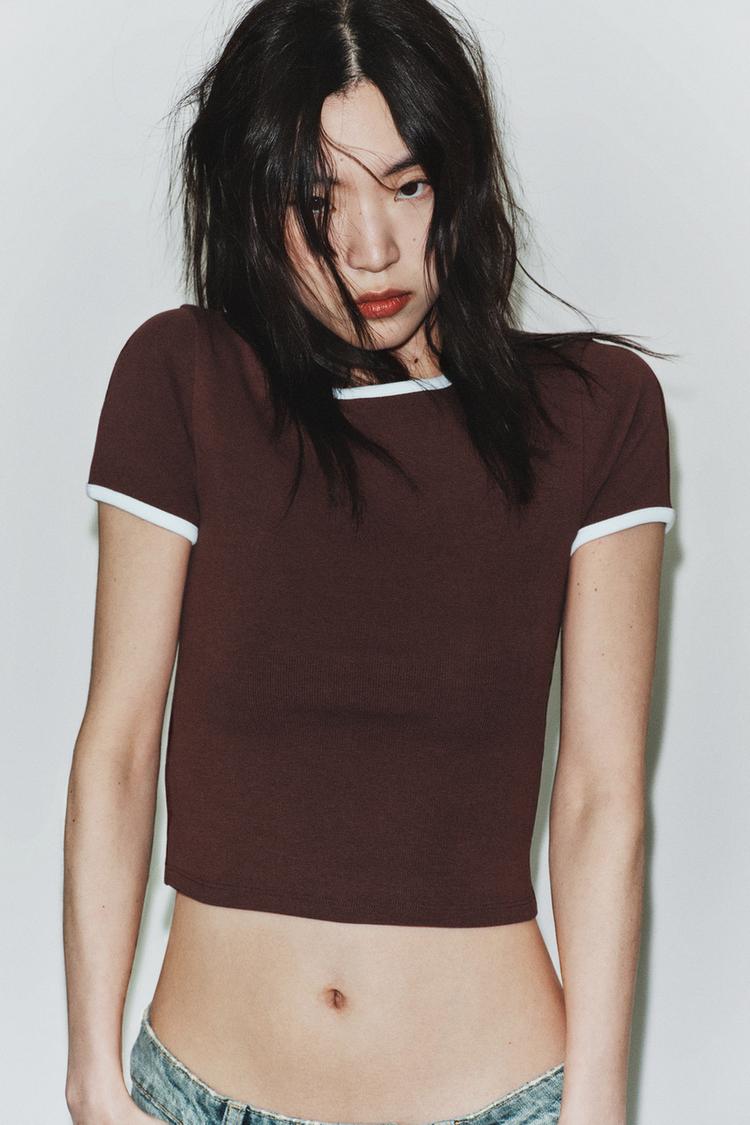 ZARA ФУТБОЛКА С КОНТРАСТНЫМИ ДЕТАЛЯМИ, КОРИЧНЕВЫЙ