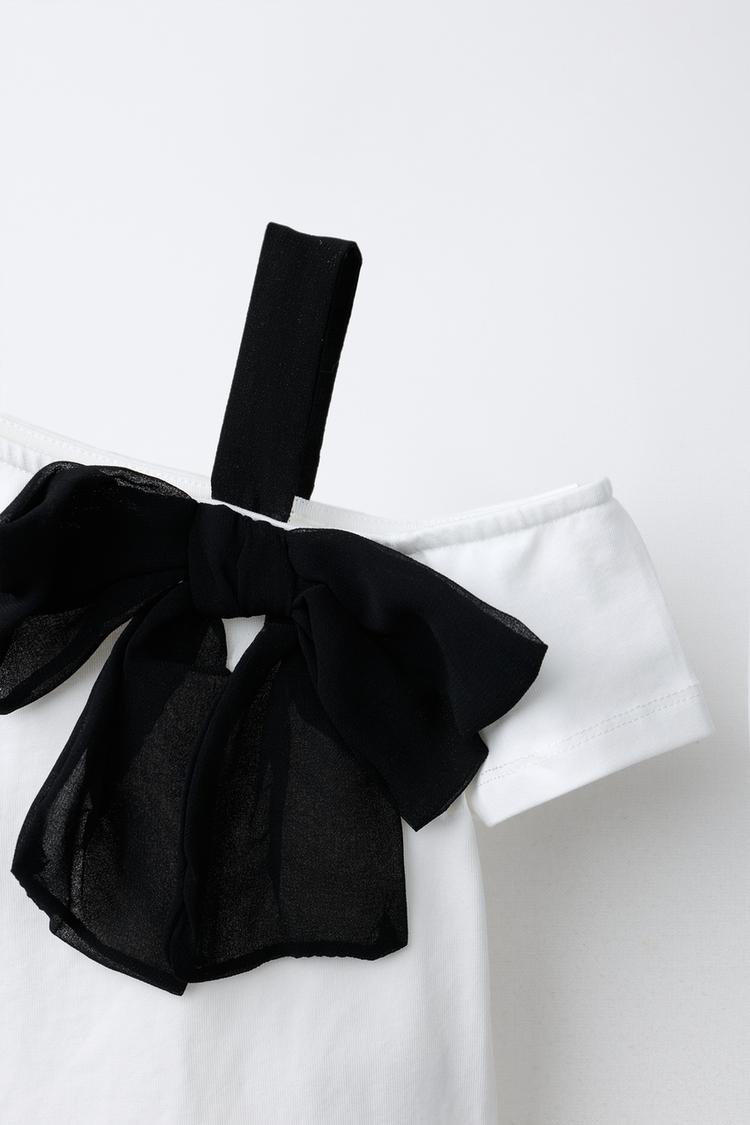 Футболка с асимметричным воротником и короткими рукавами на бретелях. С аппликацией в виде банта спереди.