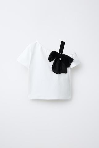 ZARA ФУТБОЛКА С КОРОТКИМИ РУКАВАМИ И БАНТОМ, БЕЛЫЙ
