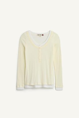 С круглым вырезом горловины и длинными рукавами. Контрастная деталь в виде двухслойной футболки. С застежкой на пуговицы спереди.