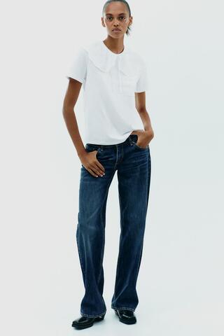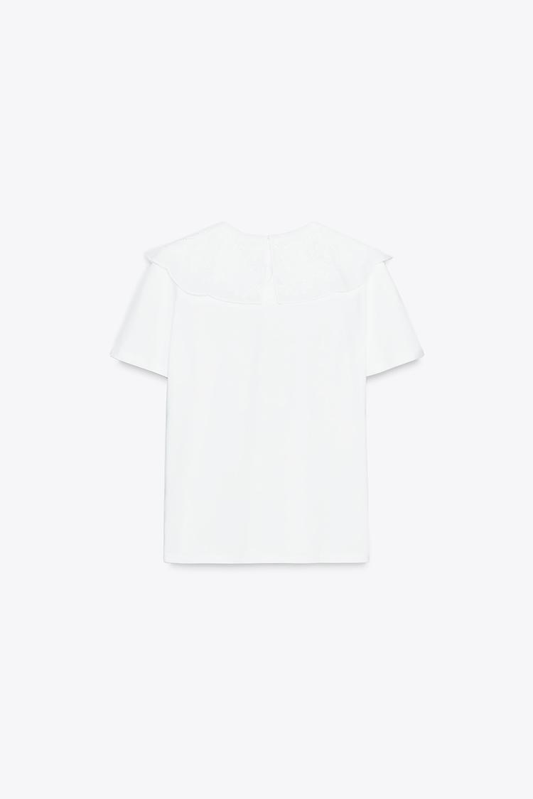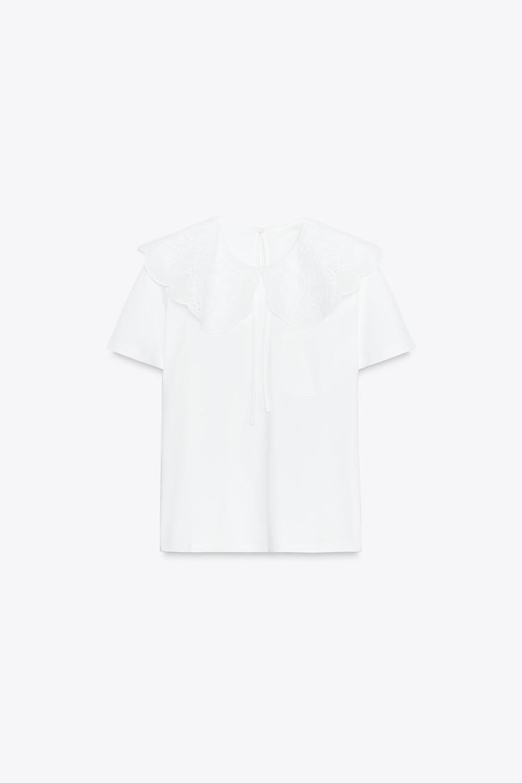 ZARA ФУТБОЛКА С КРУГЛЫМ ВЫШИТЫМ ВОРОТНИКОМ, БЕЛЫЙ