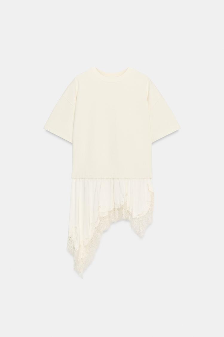 Футболка с круглым вырезом и короткими рукавами. Асимметричный низ из ткани в тон с кружевной отделкой.