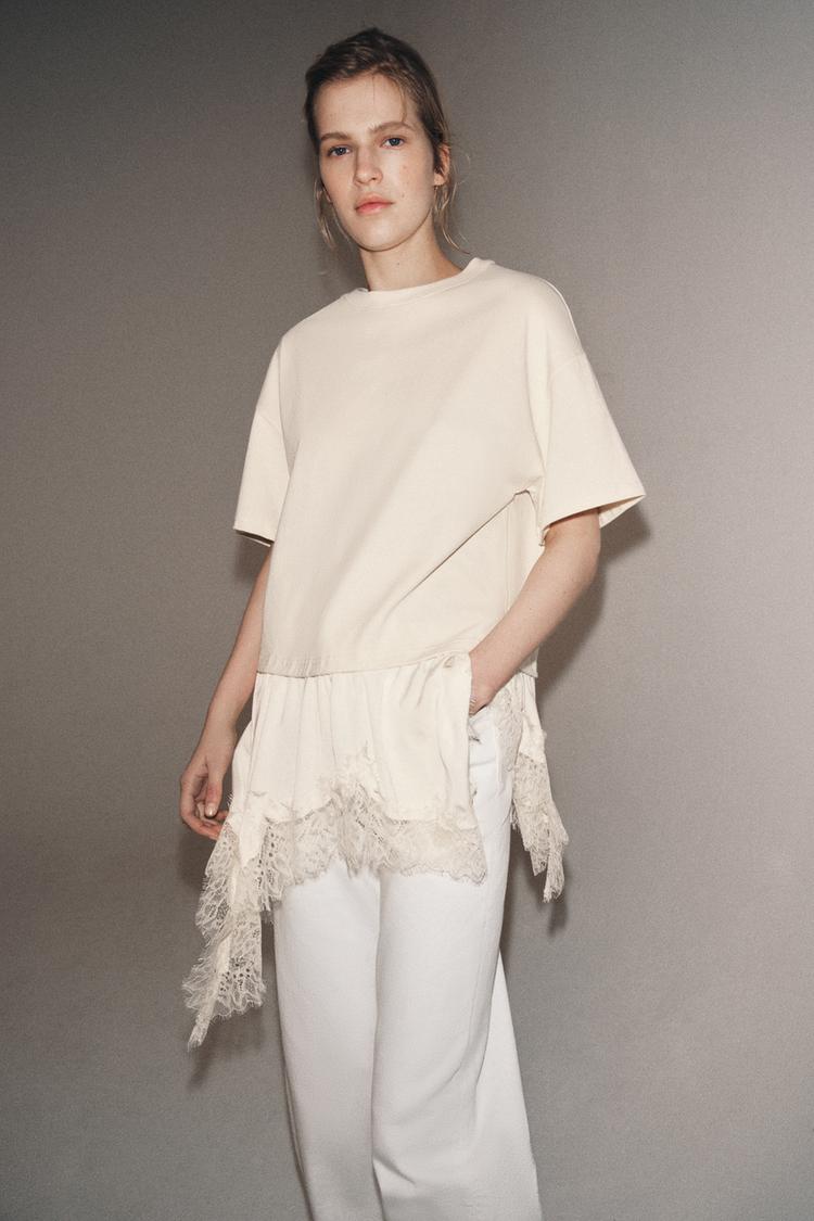 ZARA ФУТБОЛКА С КРУЖЕВНОЙ ОТДЕЛКОЙ, ЭКРЮ