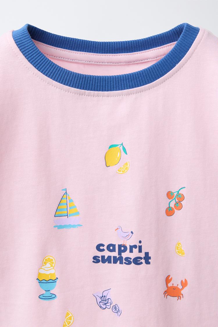 Футболка с круглым вырезом контрастного цвета и короткими рукавами. Различные летние мотивы на принте.
