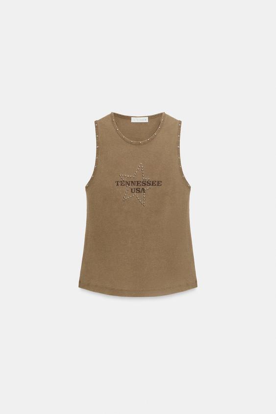 ZARA ФУТБОЛКА С НАДПИСЬЮ И ЗАКЛЕПКАМИ, ТЕМНО-КОРИЧНЕВЫЙ