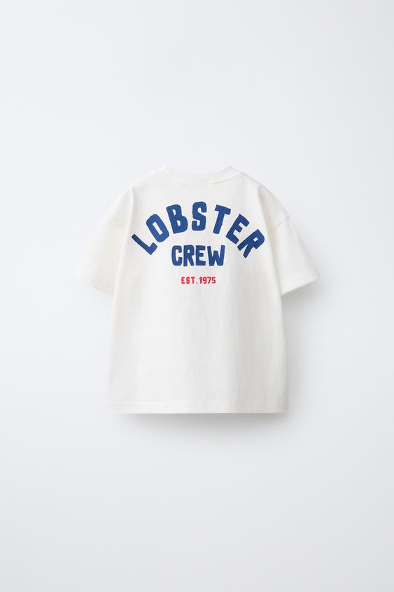 Футболка с круглым вырезом и короткими рукавами. Текстовый принт и нашивка с вышивкой в виде лангуста.