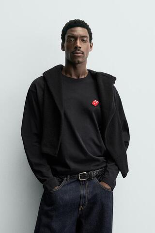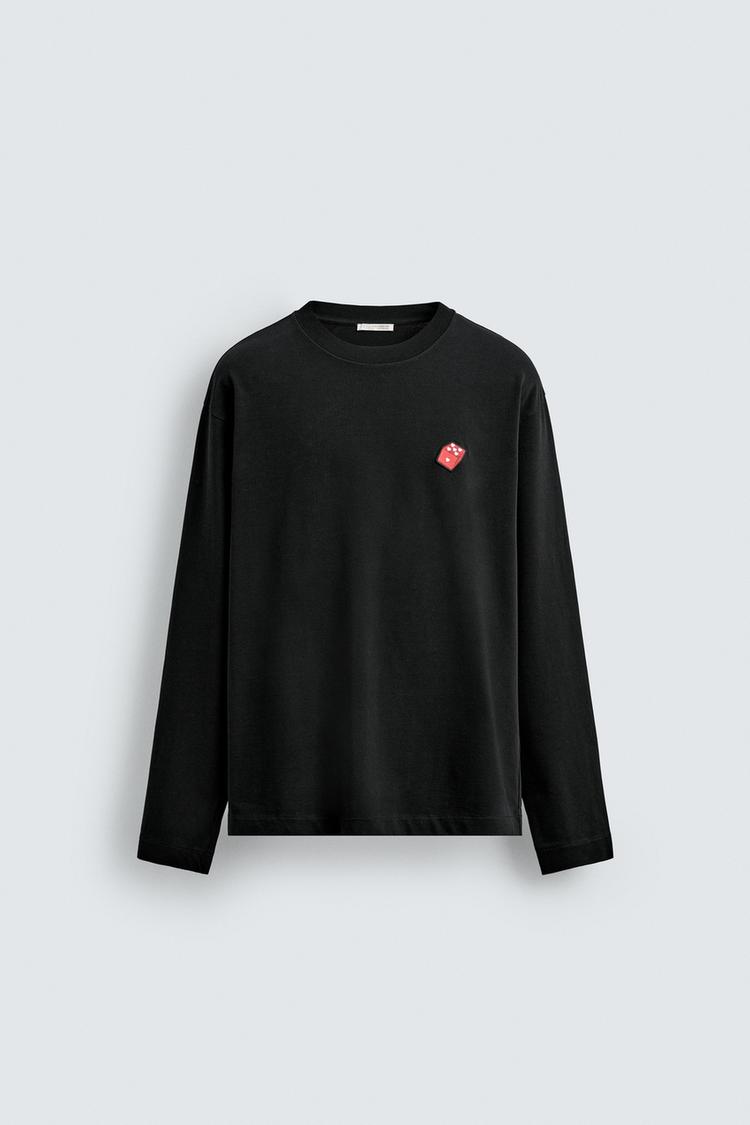 ZARA ФУТБОЛКА С НАШИВКОЙ В ВИДЕ КУБИКОВ И СЕРДЕЦ, ЧЕРНЫЙ