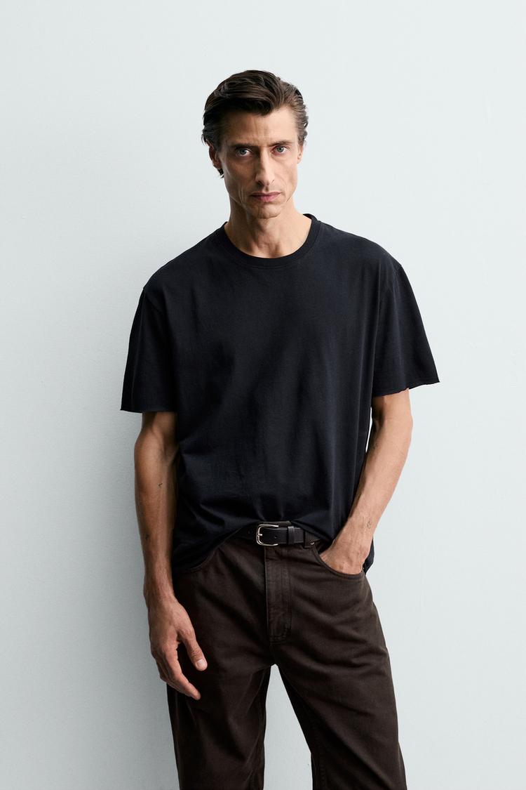 Футболка классического кроя из хлопка. Круглый вырез, короткие рукава и неровные кромки.