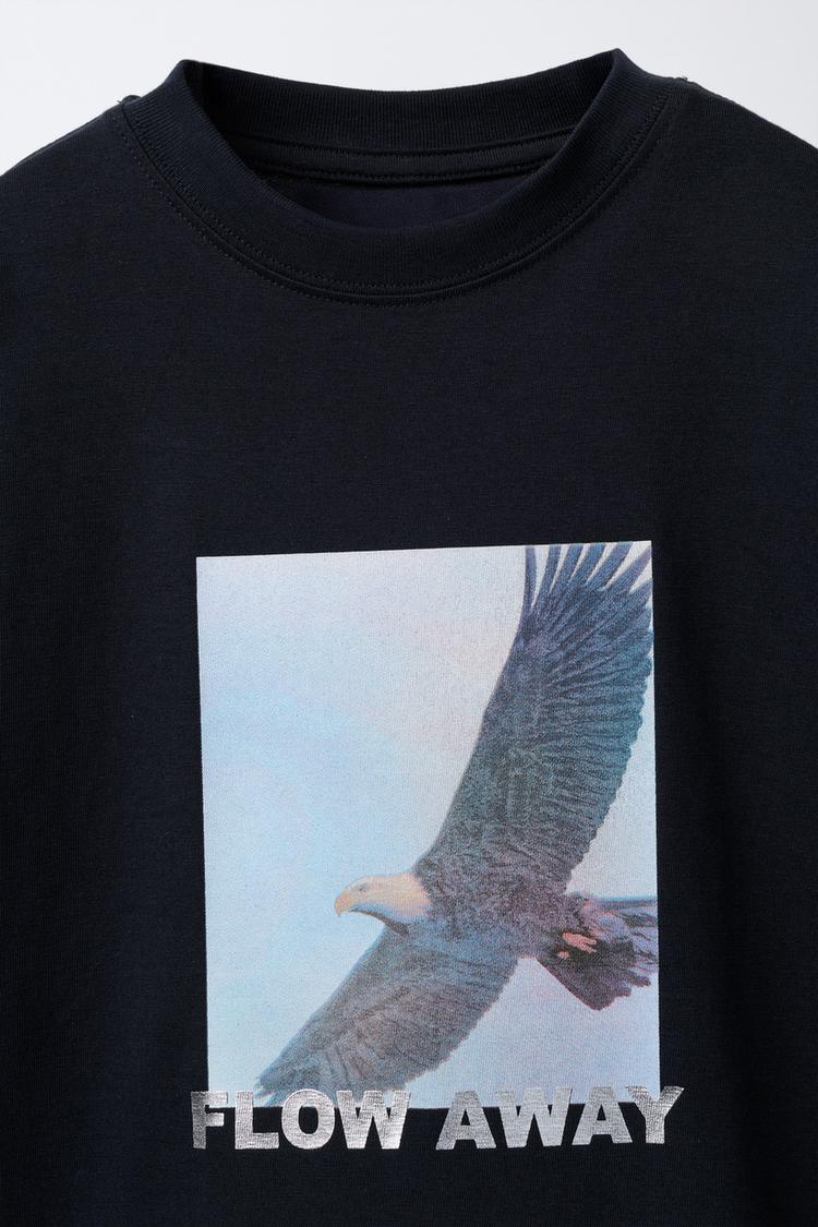 Футболка с круглым вырезом горловины и короткими рукавами. Спереди с принтом в виде фотографии орла. Основная ткань — хлопок.