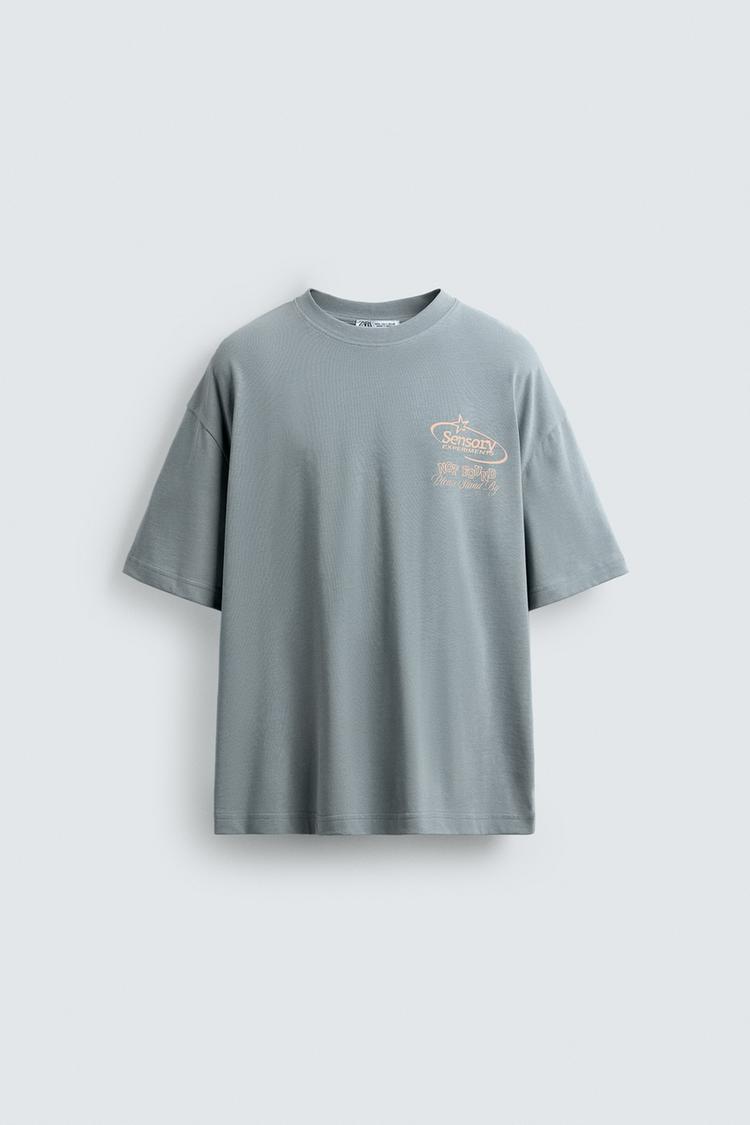 ZARA ФУТБОЛКА С ПРИНТОМ И ЭФФЕКТОМ ПОТЕРТОСТИ, ЛИНЯЛЫЙ ГОЛУБОЙ