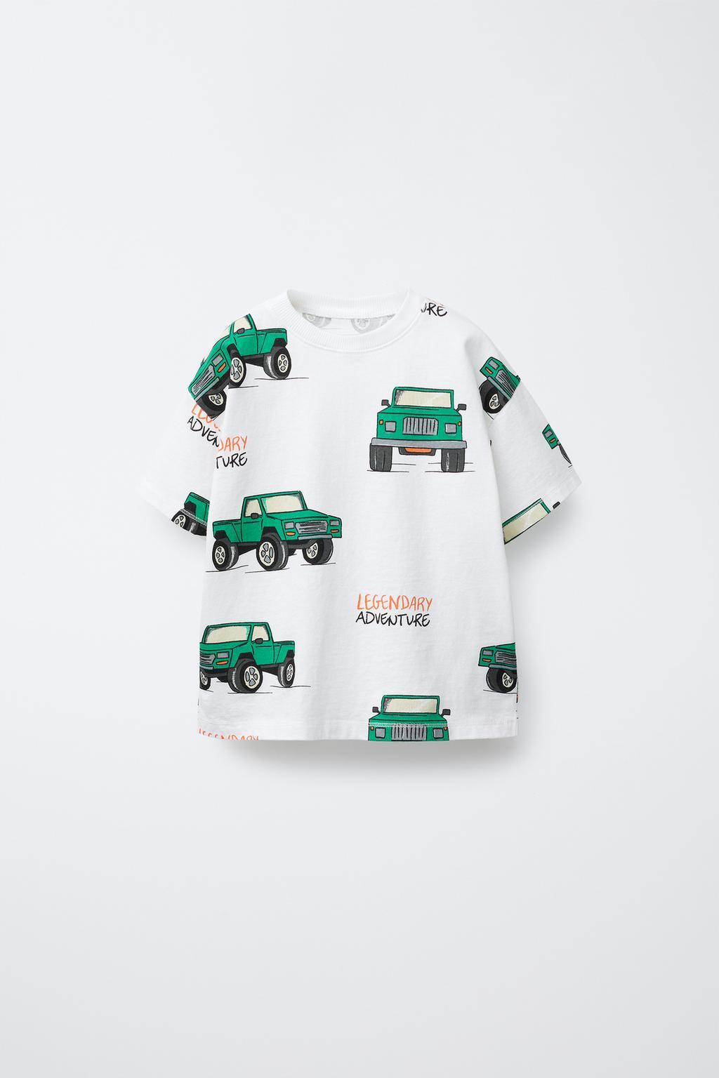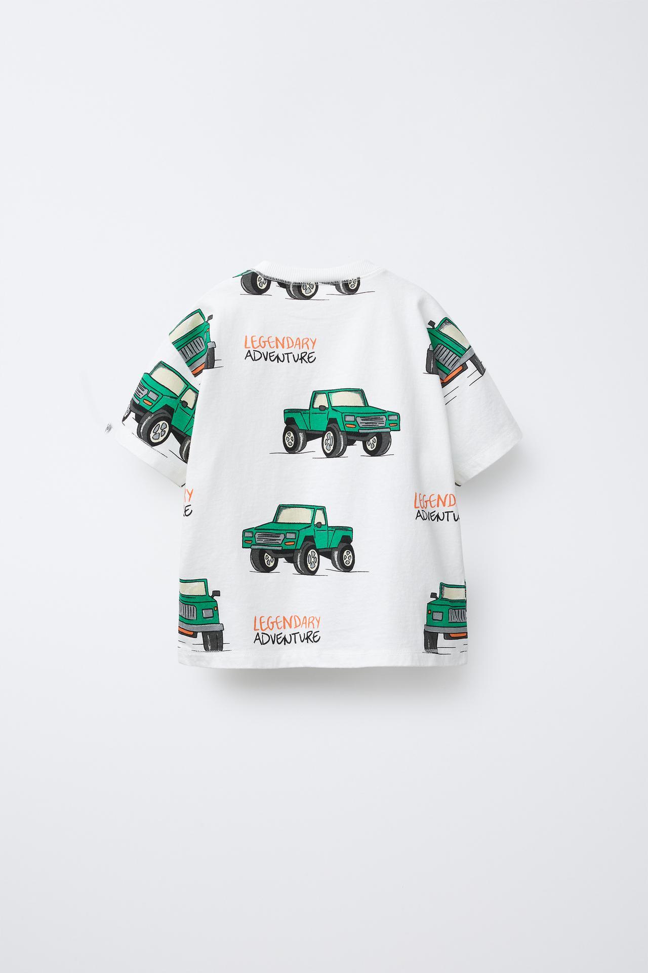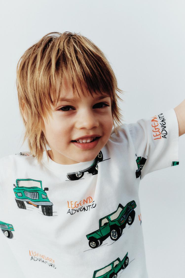 ZARA ФУТБОЛКА С ПРИНТОМ “МАШИНЫ”, ЖЕЛТОВАТО-БЕЛЫЙ