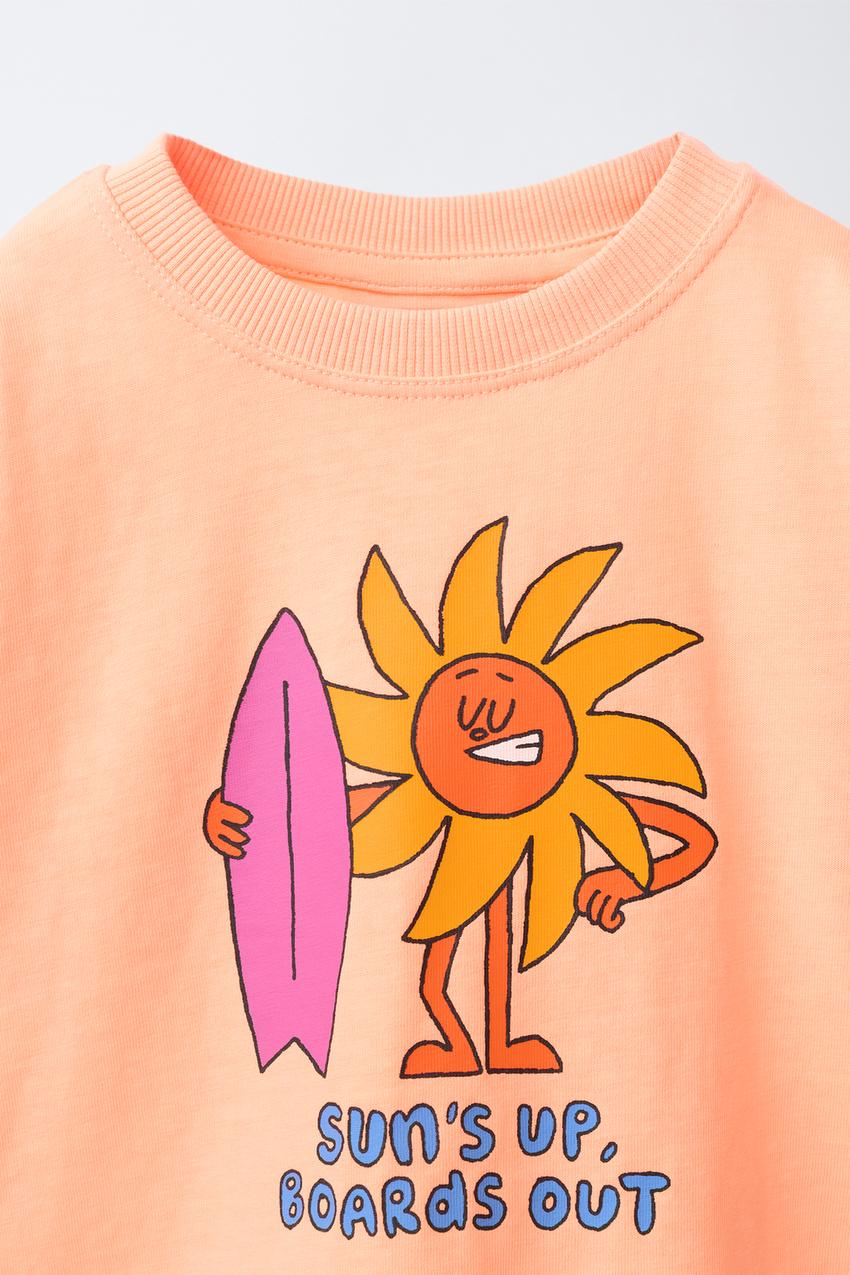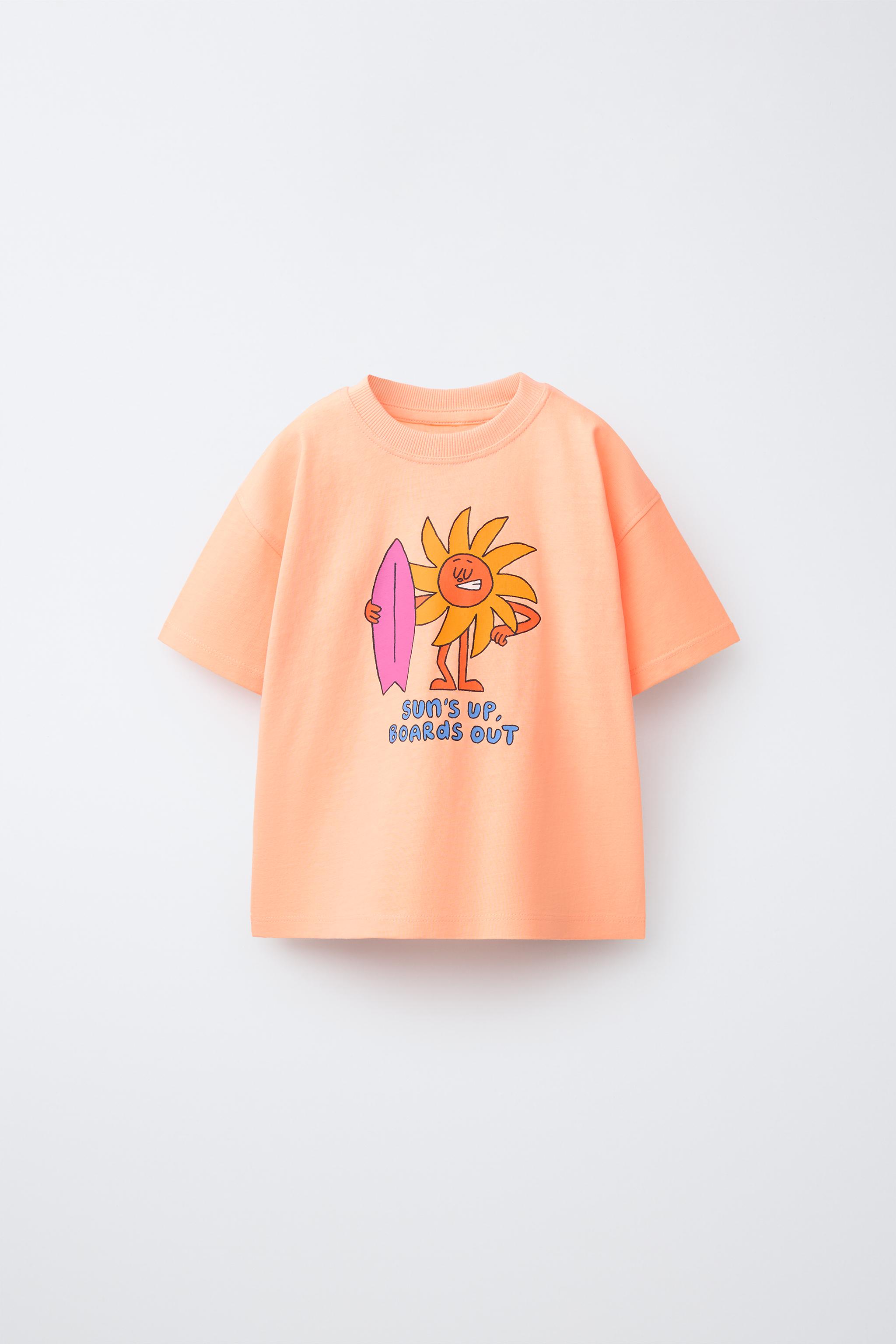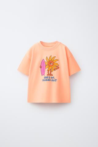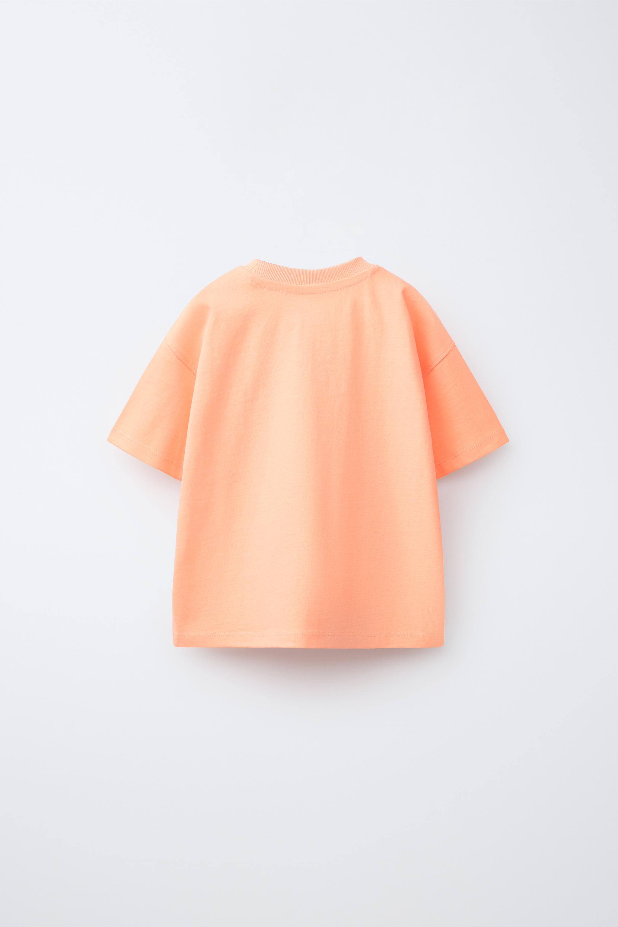 ZARA ФУТБОЛКА С ПРИНТОМ, НЕОНОВО-ОРАНЖЕВЫЙ