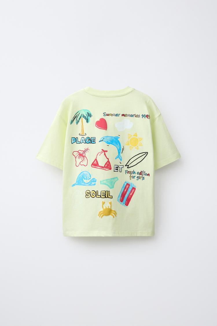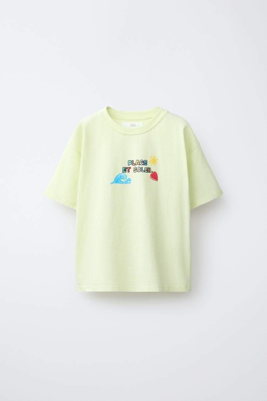 ZARA ФУТБОЛКА С ПРИНТОМ «ПЛЯЖ», ЛАЙМОВЫЙ