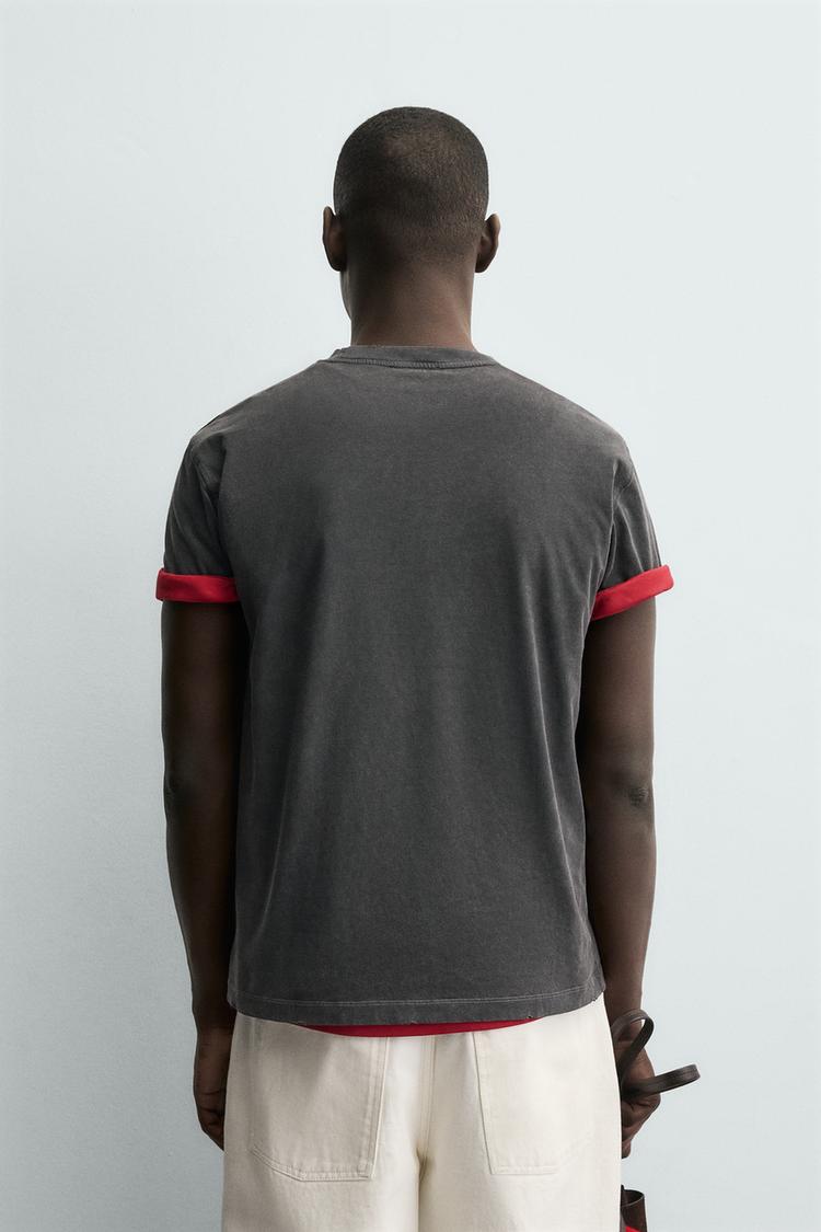 Футболка классического кроя с круглым вырезом и короткими рукавами с контрастной окантовкой. Контрастный принт спереди. Эффект потертости