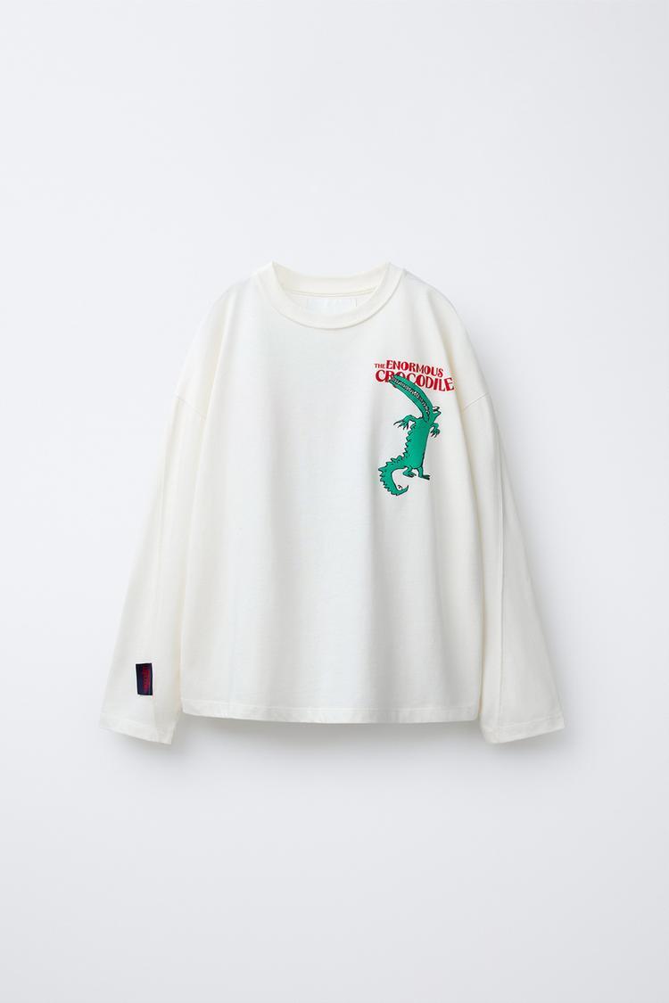 Футболка с круглым вырезом и длинными рукавами. Принт THE ENORMOUS CROCODILE ROALD DAHL © спереди и сзади. Этикетка на рукаве. Ткань 100% хлопок.
