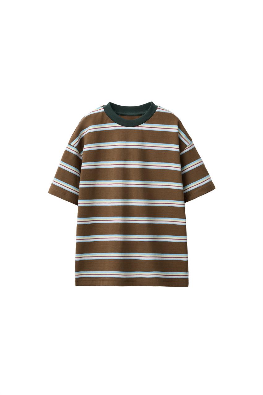 Футболка с круглым вырезом и короткими рукавами. Принт в полоску. Основная ткань — хлопок.