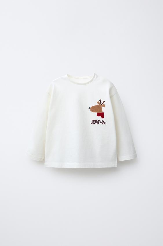ZARA ФУТБОЛКА С РЕЛЬЕФНЫМ ОЛЕНЕМ, ЭКРЮ
