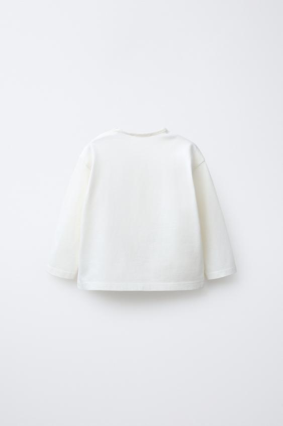 Футболка с круглым вырезом и длинными рукавами. Застежка на пуговицу на плече. Принт оленя на груди с рельефной деталью. Ткань 100% хлопок.