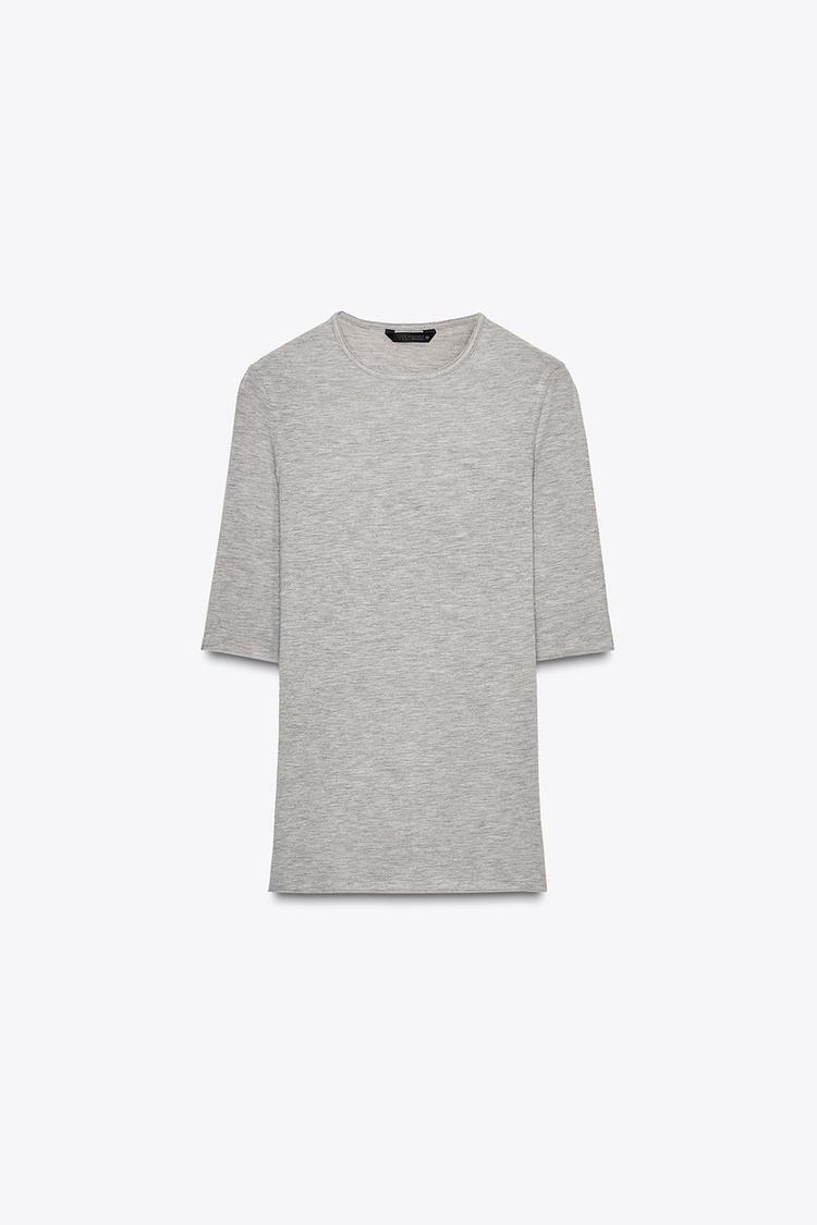 Футболка из пряжи с 14% шерсти. Круглый вырез и рукава три четверти. Прямой низ.