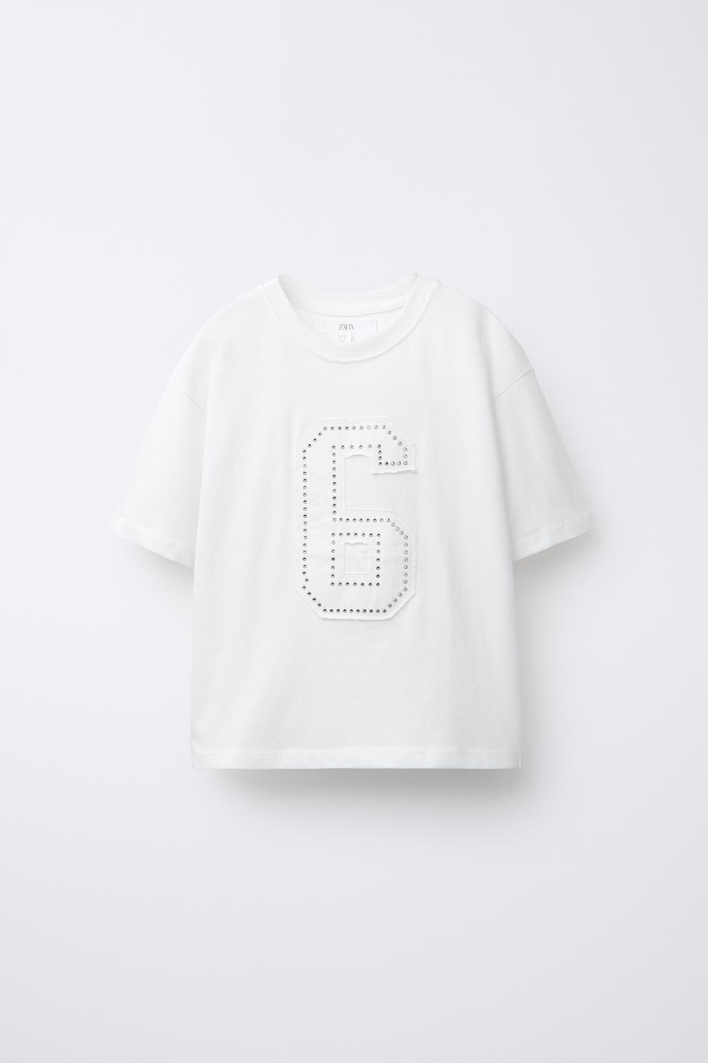 ZARA ФУТБОЛКА С ЦИФРОЙ И СТРАЗАМИ, БЕЛЫЙ
