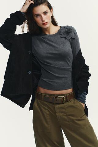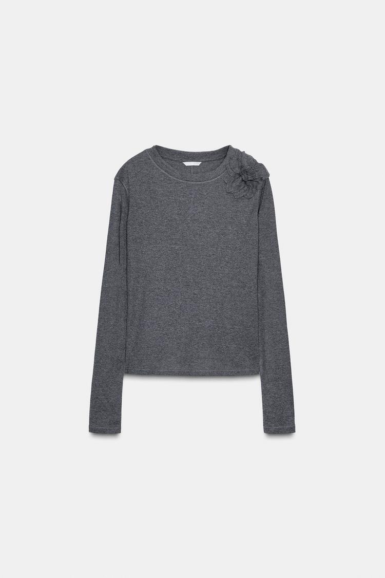 ZARA ФУТБОЛКА С ЦВЕТАМИ СПЕРЕДИ, ТЕМНО-СЕРЫЙ