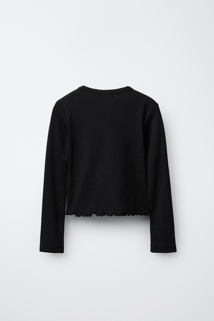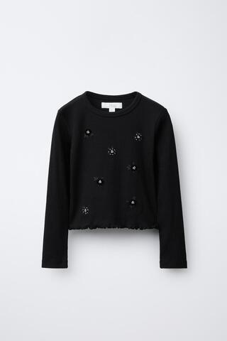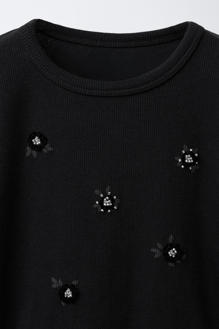 ZARA ФУТБОЛКА С ЦВЕТОЧНОЙ АППЛИКАЦИЕЙ, ЧЕРНЫЙ