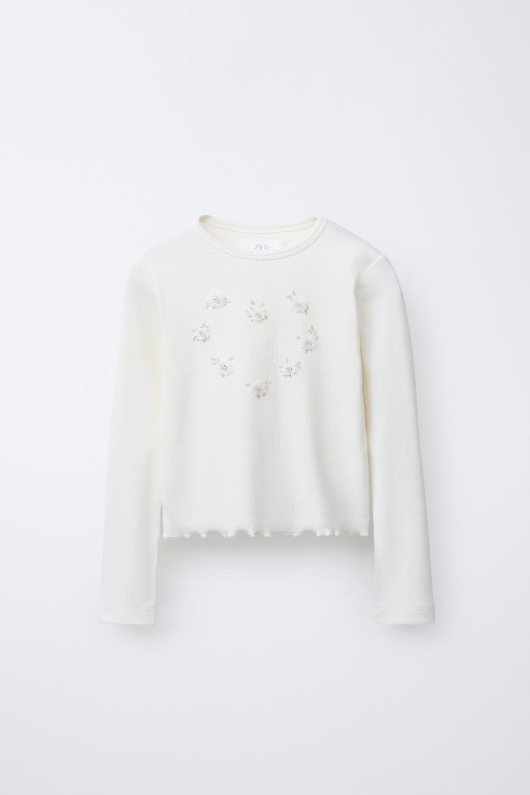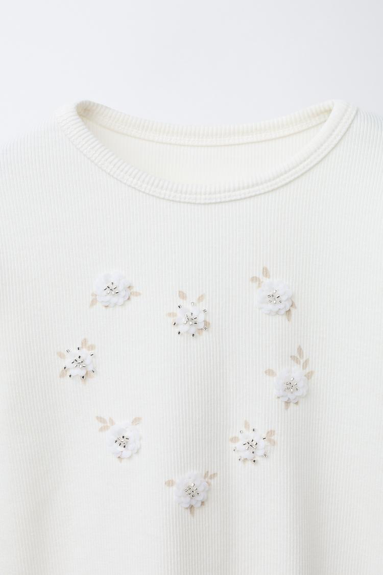 ZARA ФУТБОЛКА С ЦВЕТОЧНОЙ АППЛИКАЦИЕЙ, ЖЕЛТОВАТО-БЕЛЫЙ
