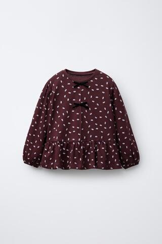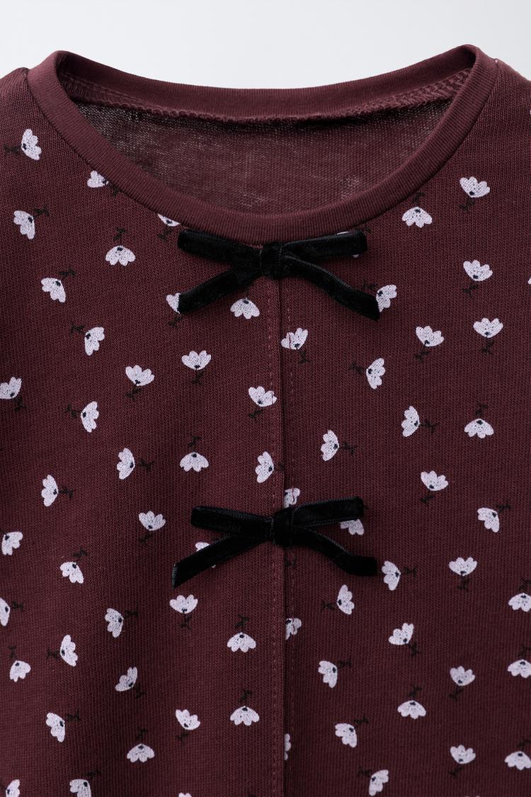 ZARA ФУТБОЛКА С ЦВЕТОЧНЫМ ПРИНТОМ И БАРХАТНЫМ БАНТОМ, ГРАНАТОВЫЙ