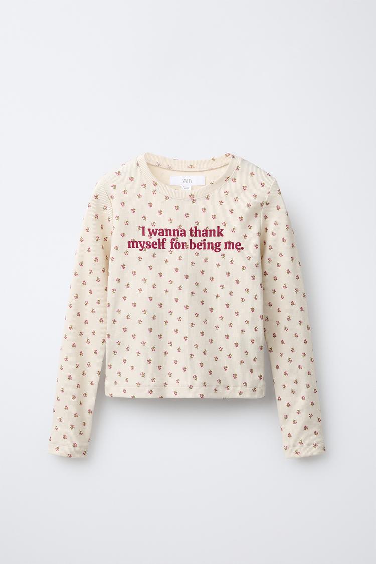ZARA ФУТБОЛКА С ЦВЕТОЧНЫМ ПРИНТОМ И НАДПИСЬЮ, БЕЖЕВЫЙ