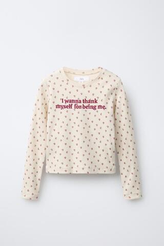 Футболка с круглым вырезом и длинными рукавами. Цветочный принт и надпись спереди.