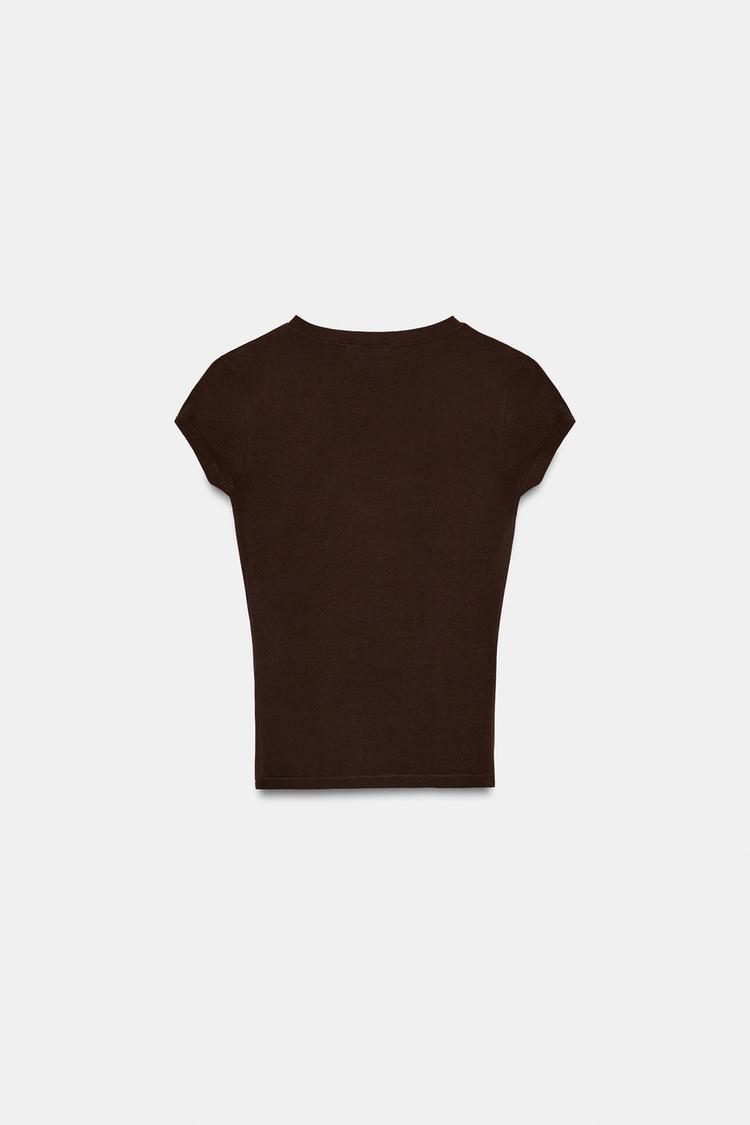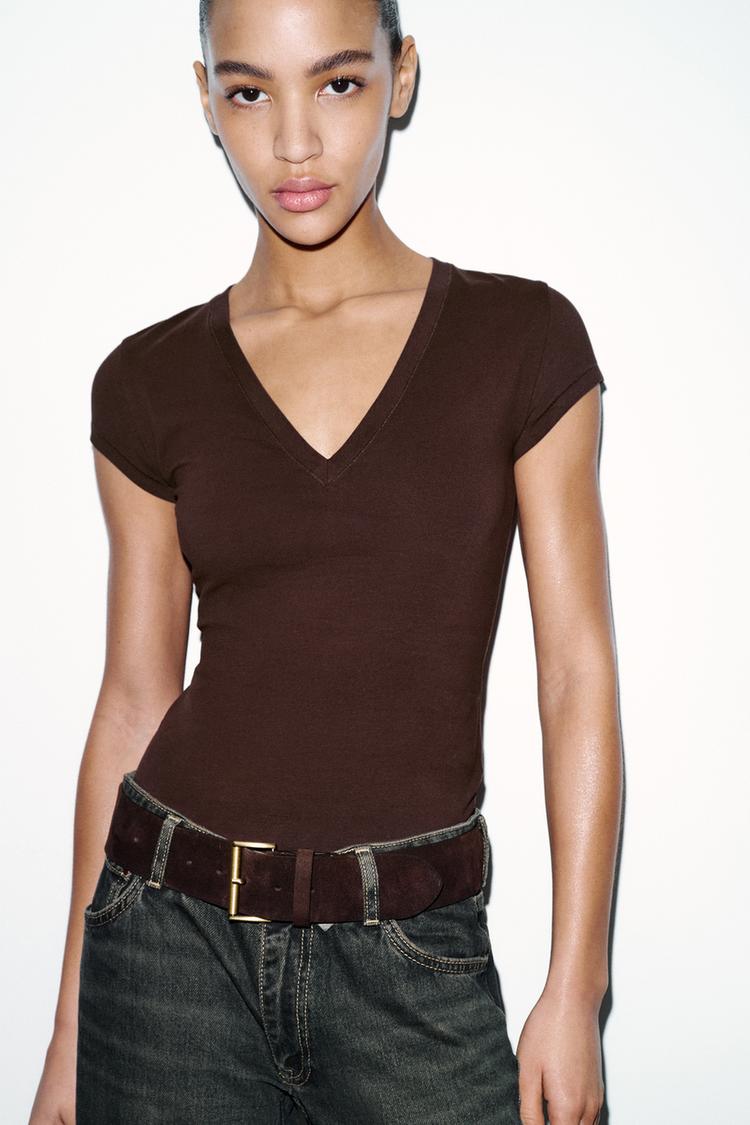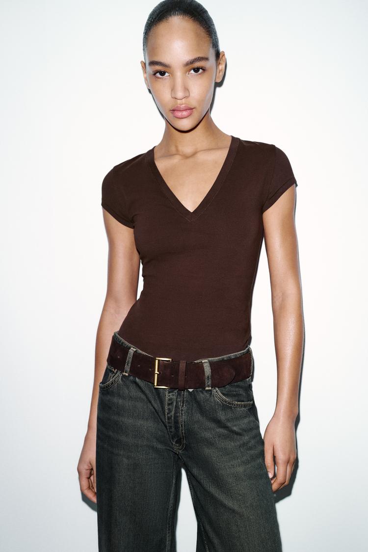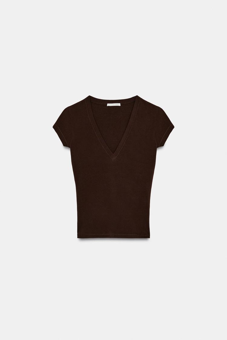 ZARA ФУТБОЛКА С V-ОБРАЗНЫМ ВЫРЕЗОМ, КОРИЧНЕВЫЙ