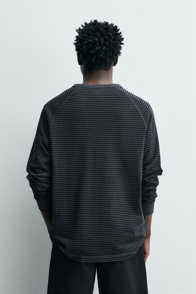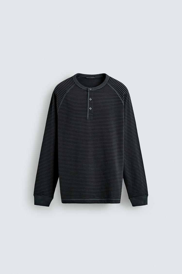 Футболка стандартного кроя из хлопковой ткани. Круглый вырез с застежкой на пуговицы спереди. Длинные рукава реглан.