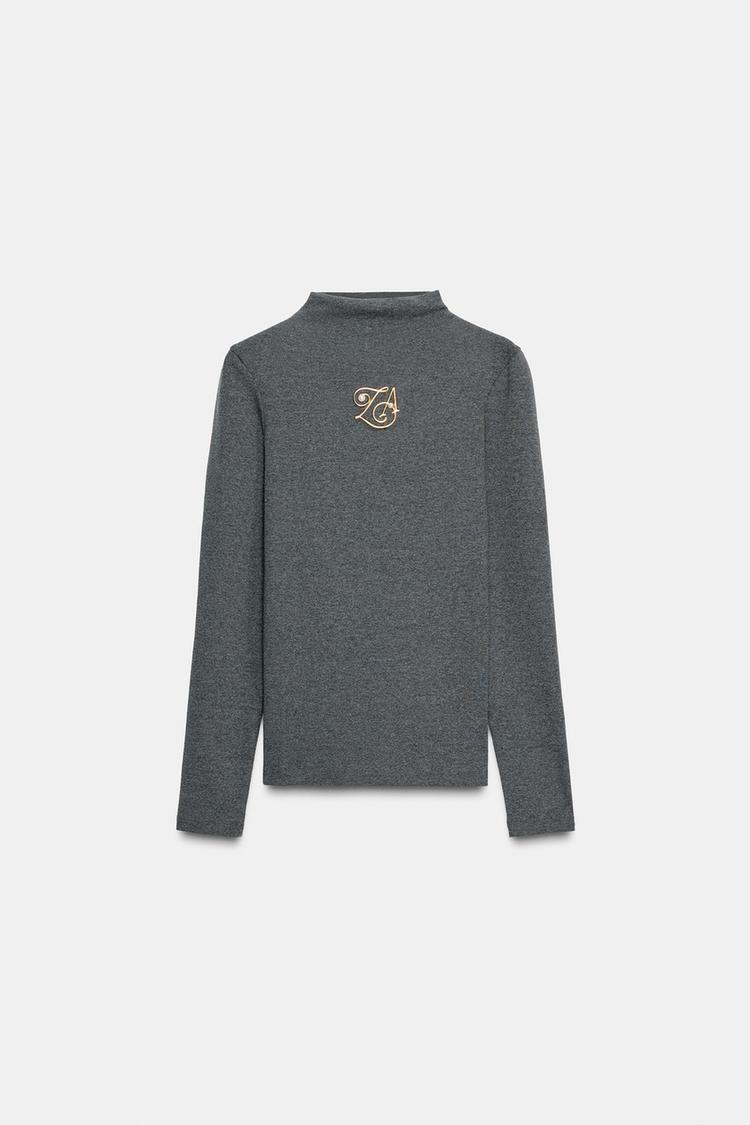 ZARA ФУТБОЛКА С ВОРОТНИКОМ-СТОЙКОЙ И БРОШЬЮ, ТЕМНО-СЕРЫЙ