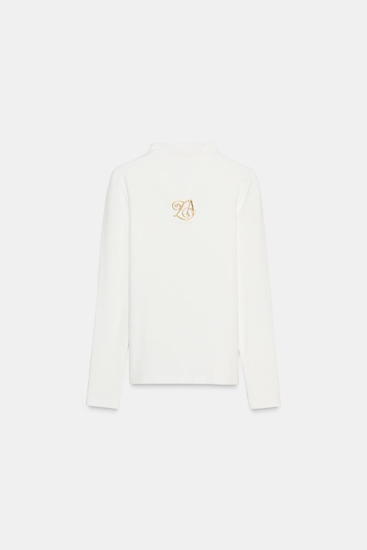 Футболка с воротником-стойкой и длинными рукавами. Брошь ZA на груди. Прямой нижний край.