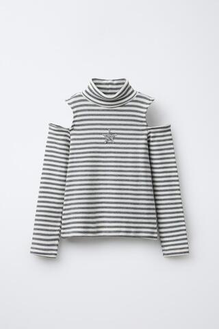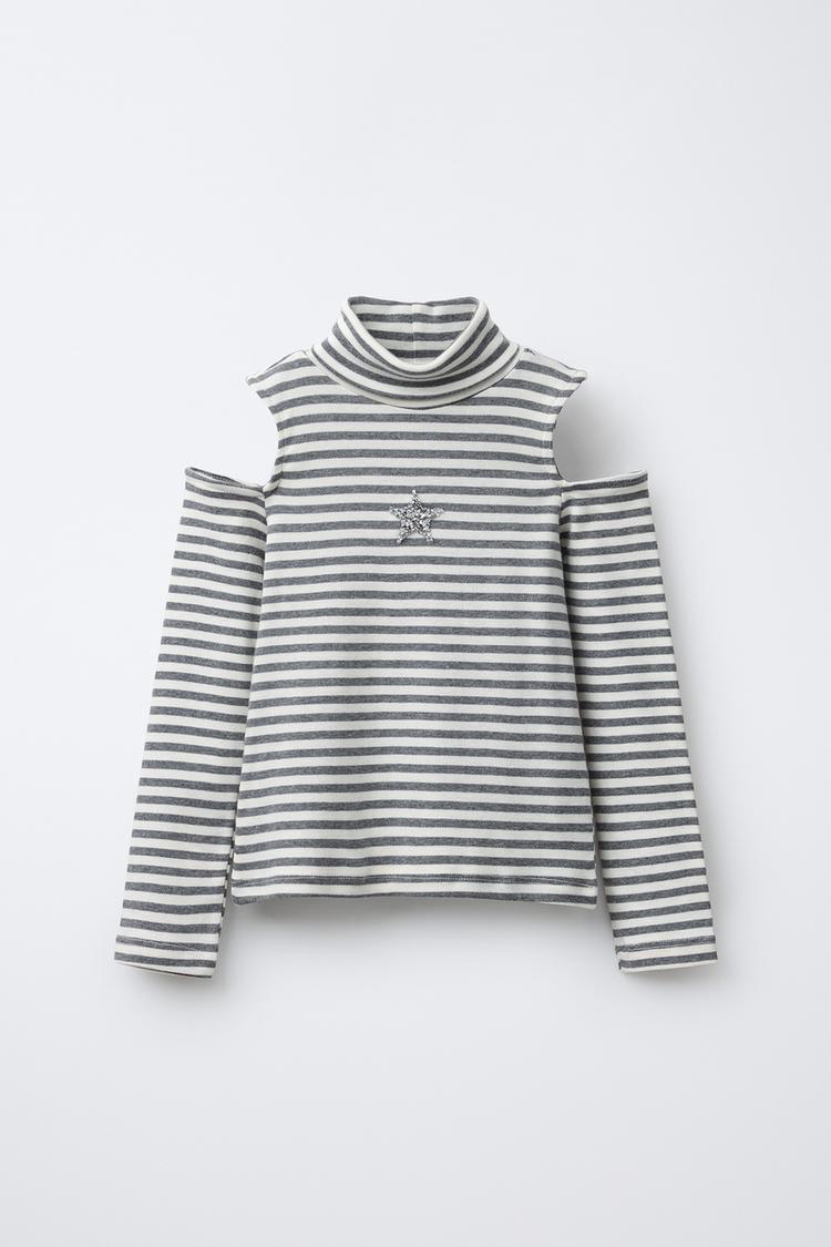 Футболка с воротником-стойкой и длинными рукавами. Вырезы на плечах. Полосатый принт и аппликация в виде звезды спереди. Ткань с 80% содержанием хлопка.