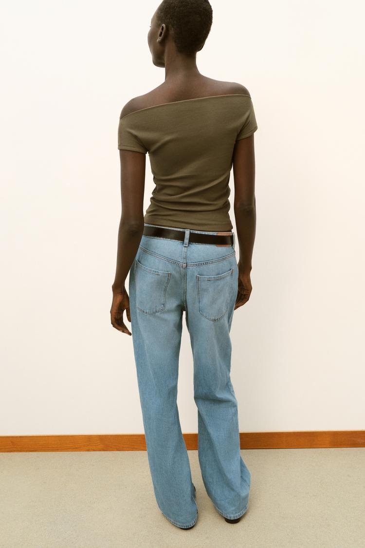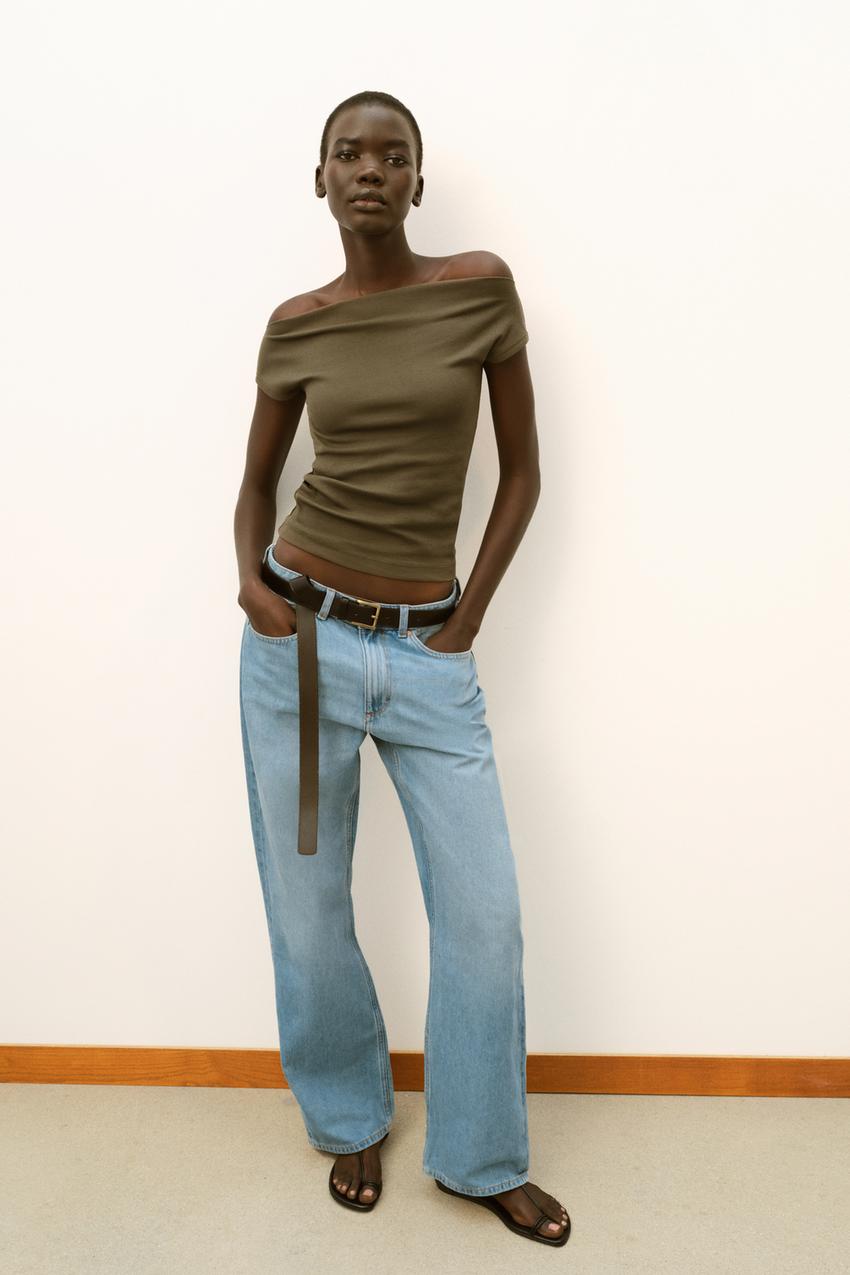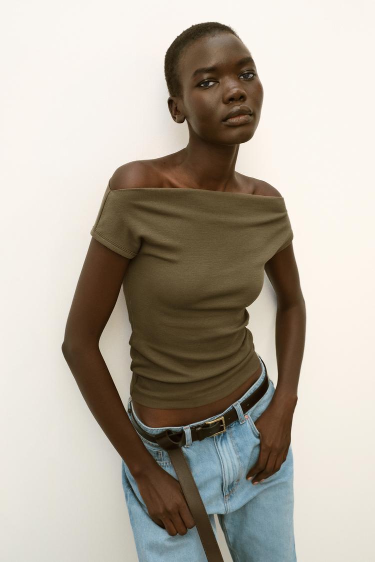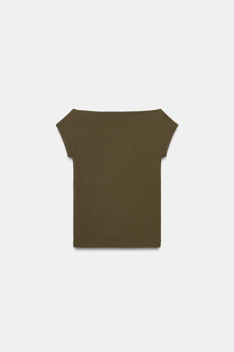 ZARA ФУТБОЛКА С ВЫРЕЗОМ ЛОДОЧКОЙ, ХАКИ