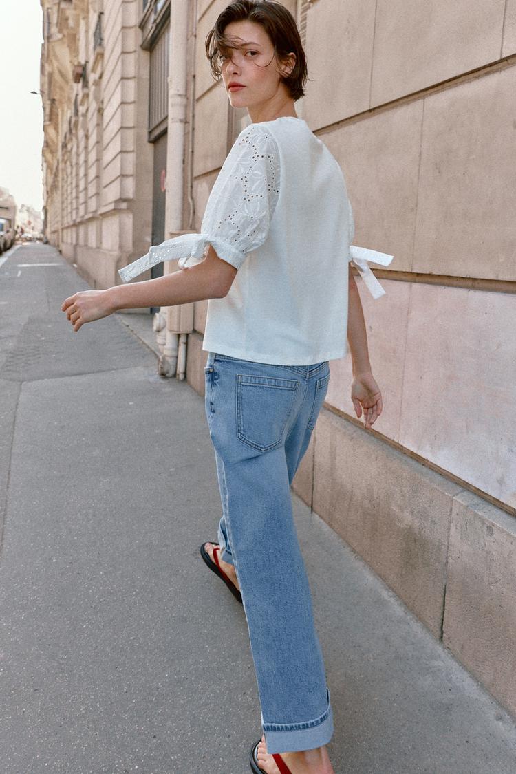 Футболка с круглым вырезом из основной хлопковой пряжи. Короткие рукава-фонарики с перфорированной вышивкой и завязками в тон. Прямой низ.