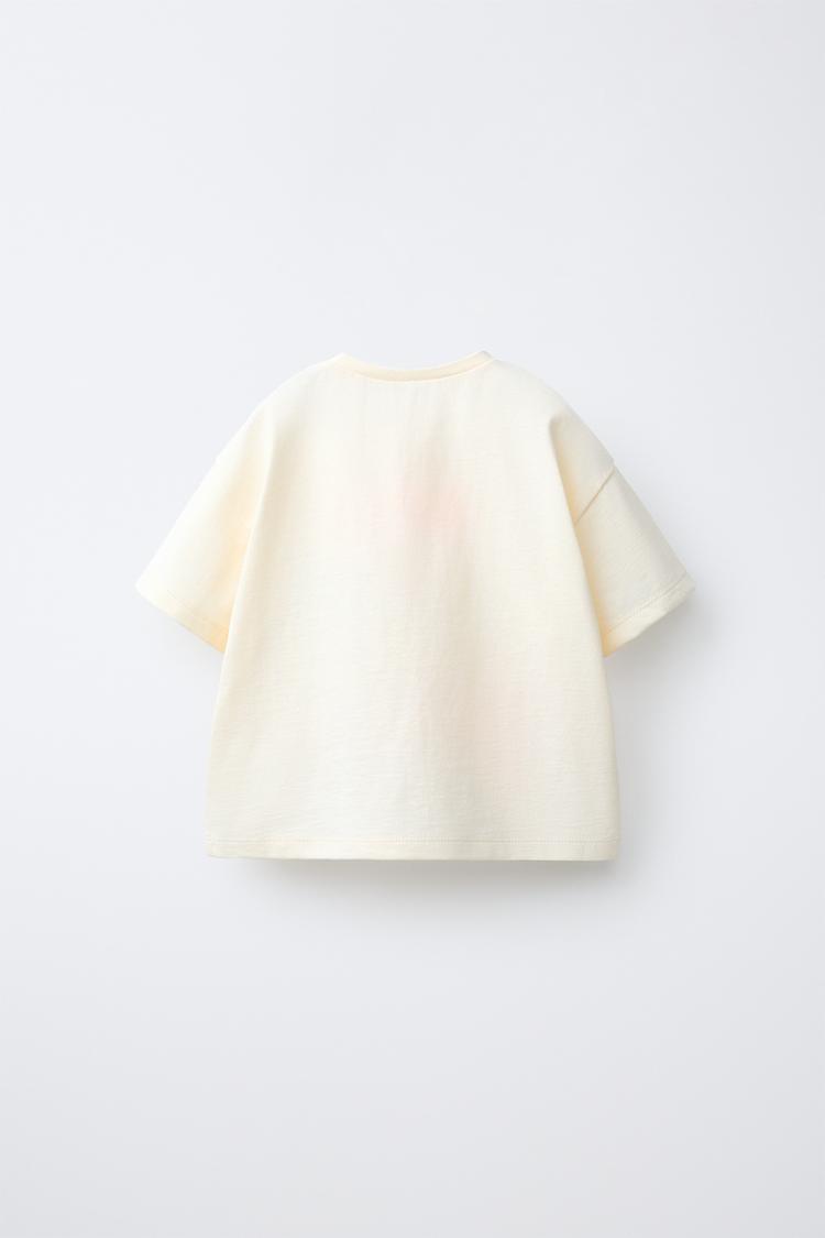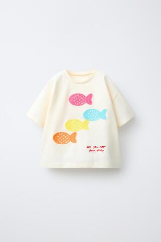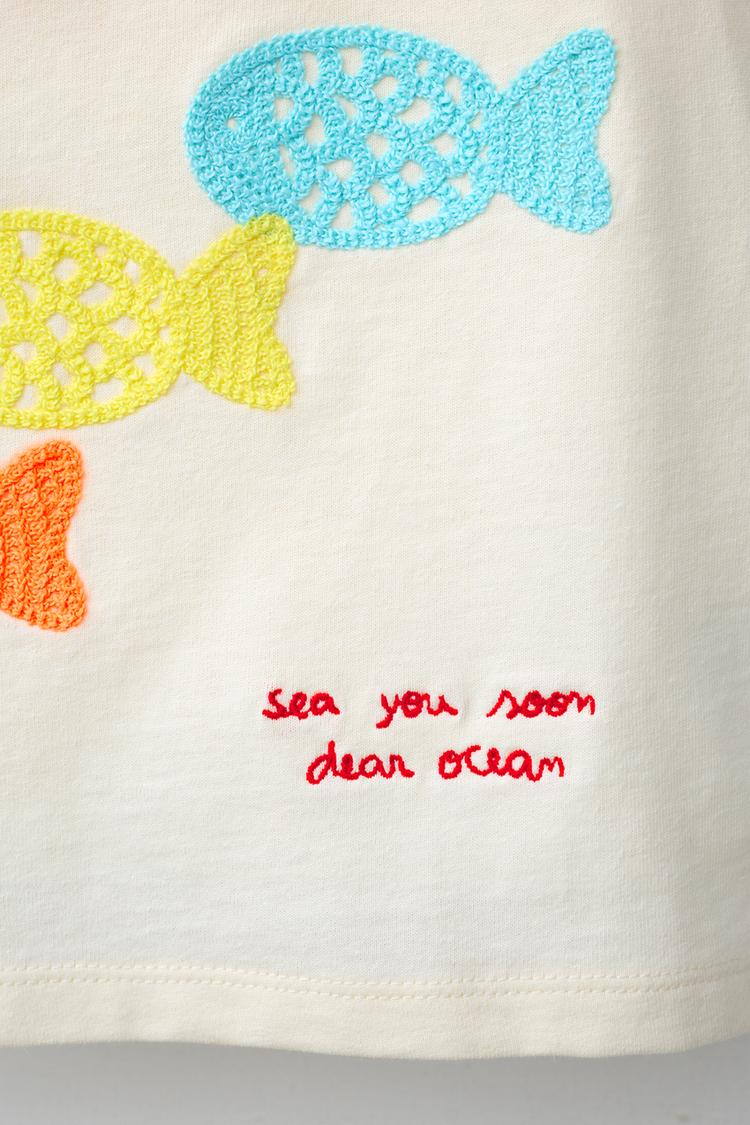 ZARA ФУТБОЛКА С ВЫШИВКОЙ РЫБОК, ЖЕЛТОВАТО-БЕЛЫЙ