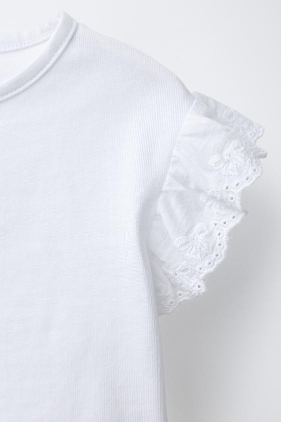 Футболка с круглым вырезом и короткими рукавами, со швейцарской вышивкой и воланами. Застежка-капля на пуговице на спине.