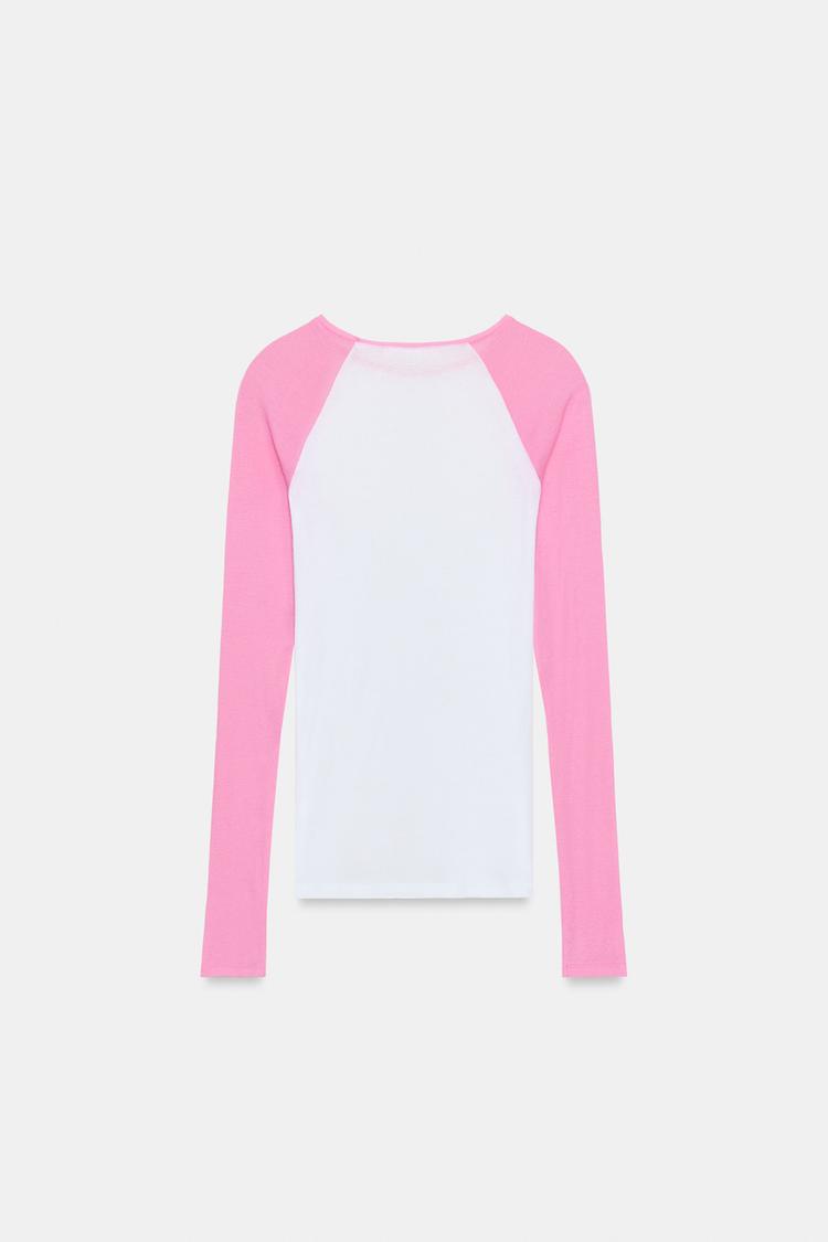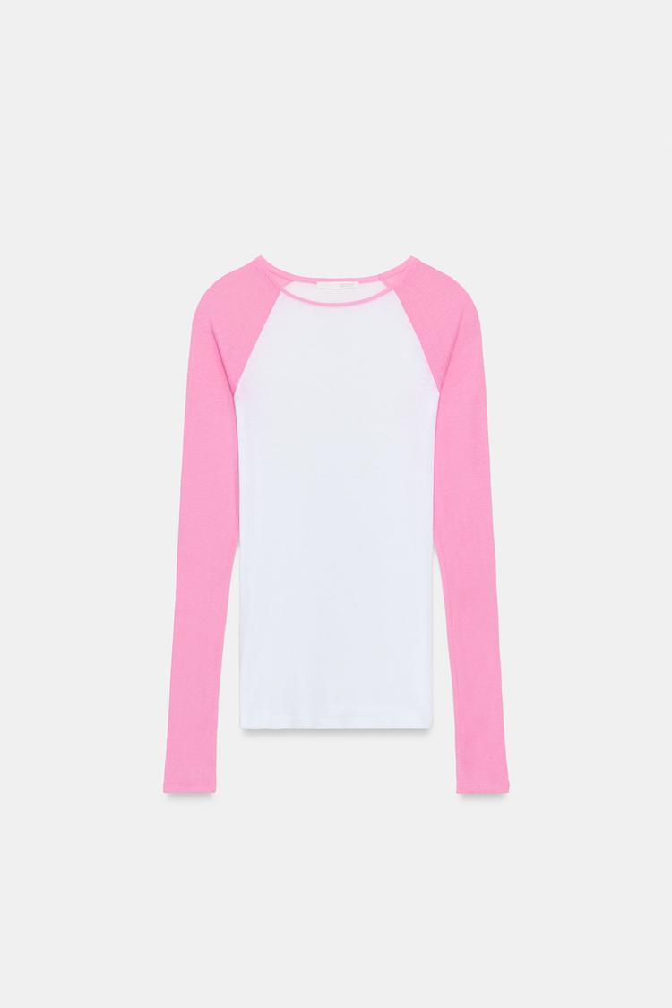 ZARA ФУТБОЛКА SUPIMA® С КОНТРАСТНЫМИ РУКАВАМИ, РОЗОВЫЙ/БЕЛЫЙ