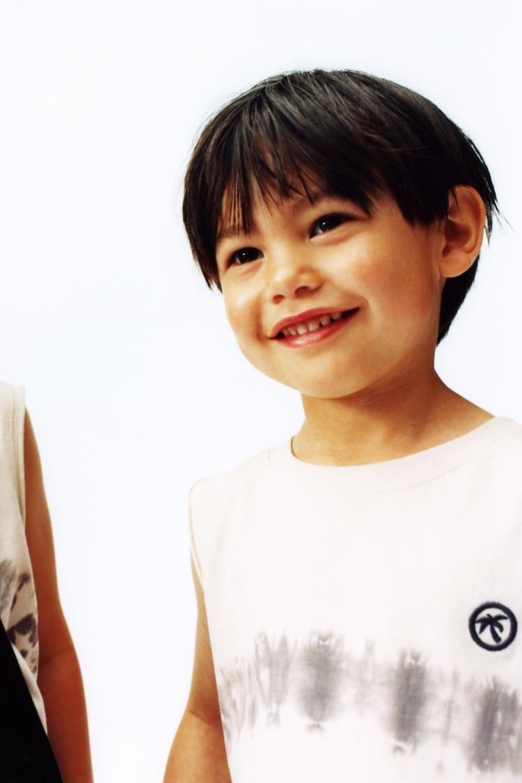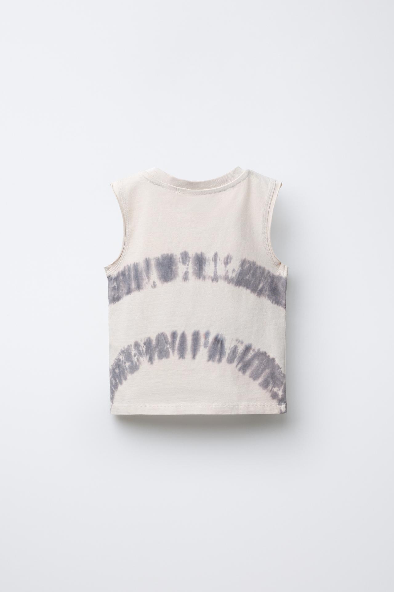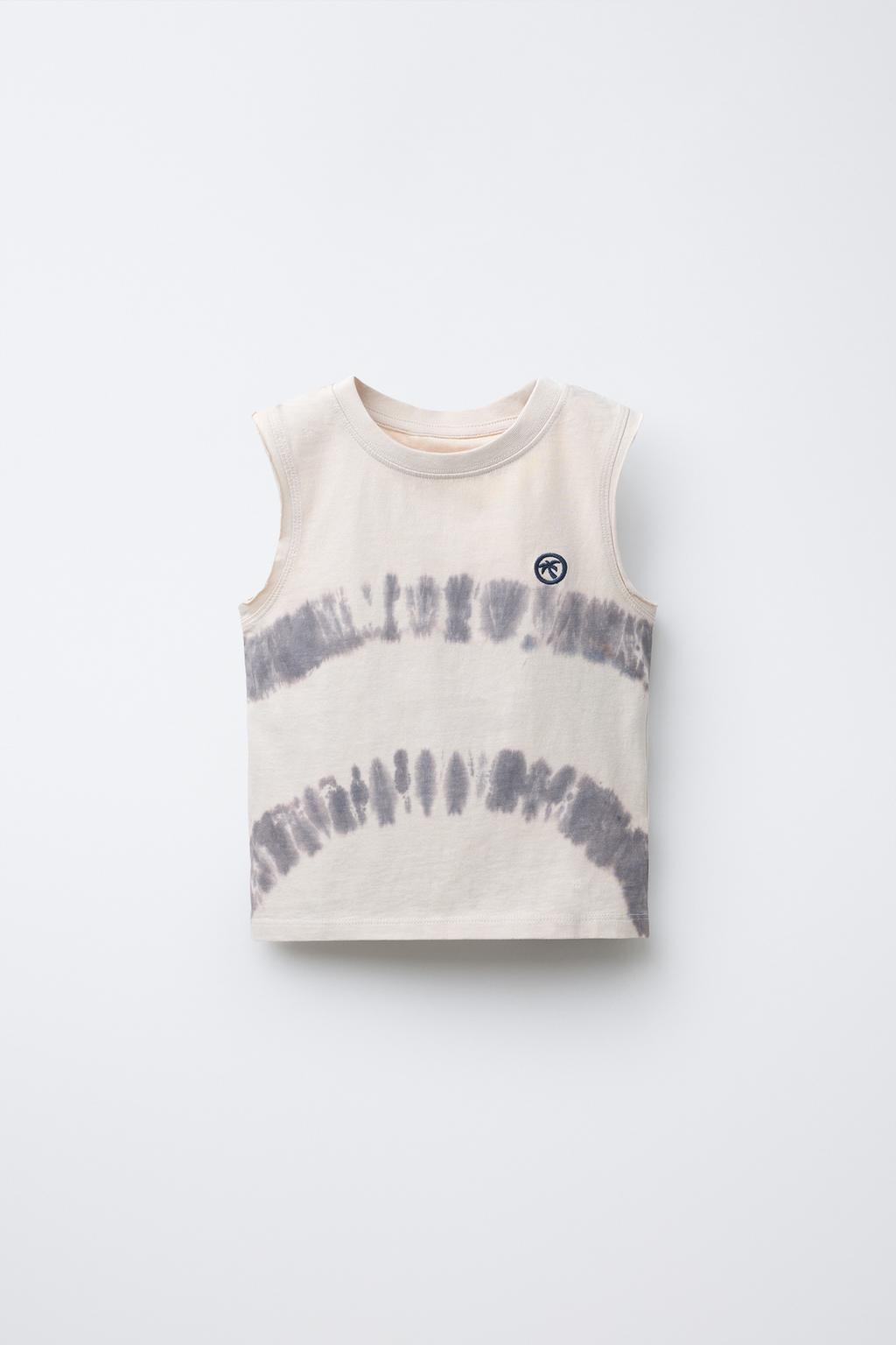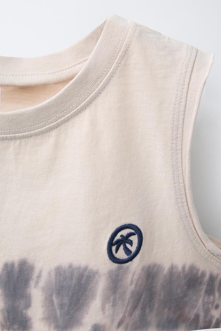 Футболка без рукавов с круглым вырезом. Принт тай-дай и вышивка на груди. Изготовлена из 100% хлопка.