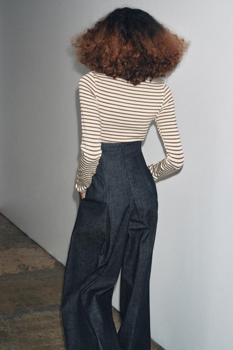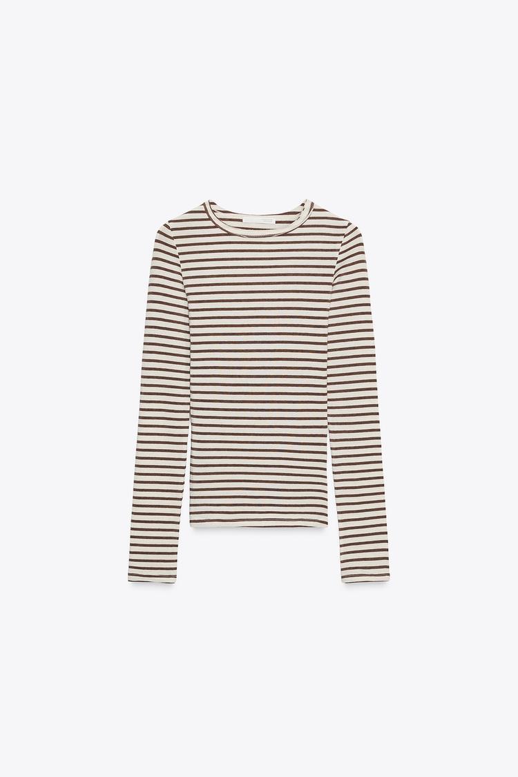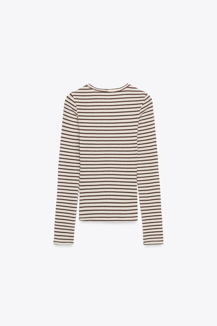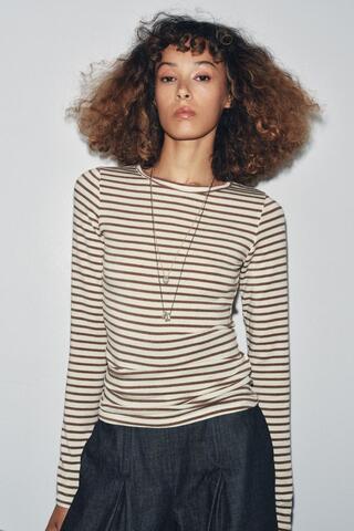 ZARA ФУТБОЛКА В ПОЛОСКУ С ДЛИННЫМИ РУКАВАМИ, ЭКРЮ/КОРИЧНЕВЫЙ
