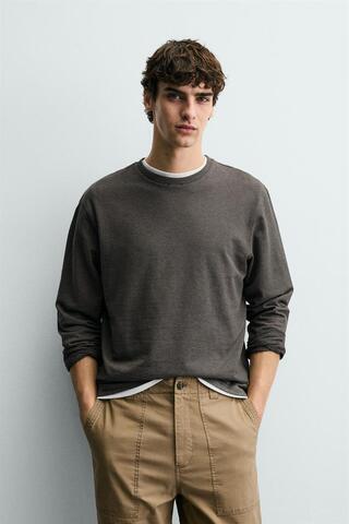 Футболка свободного кроя с круглым вырезом и длинными рукавами.