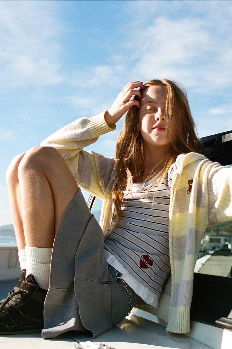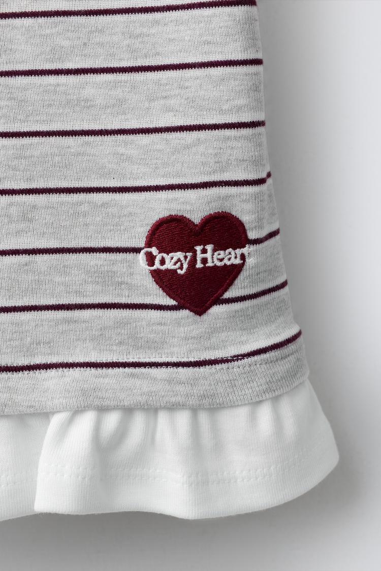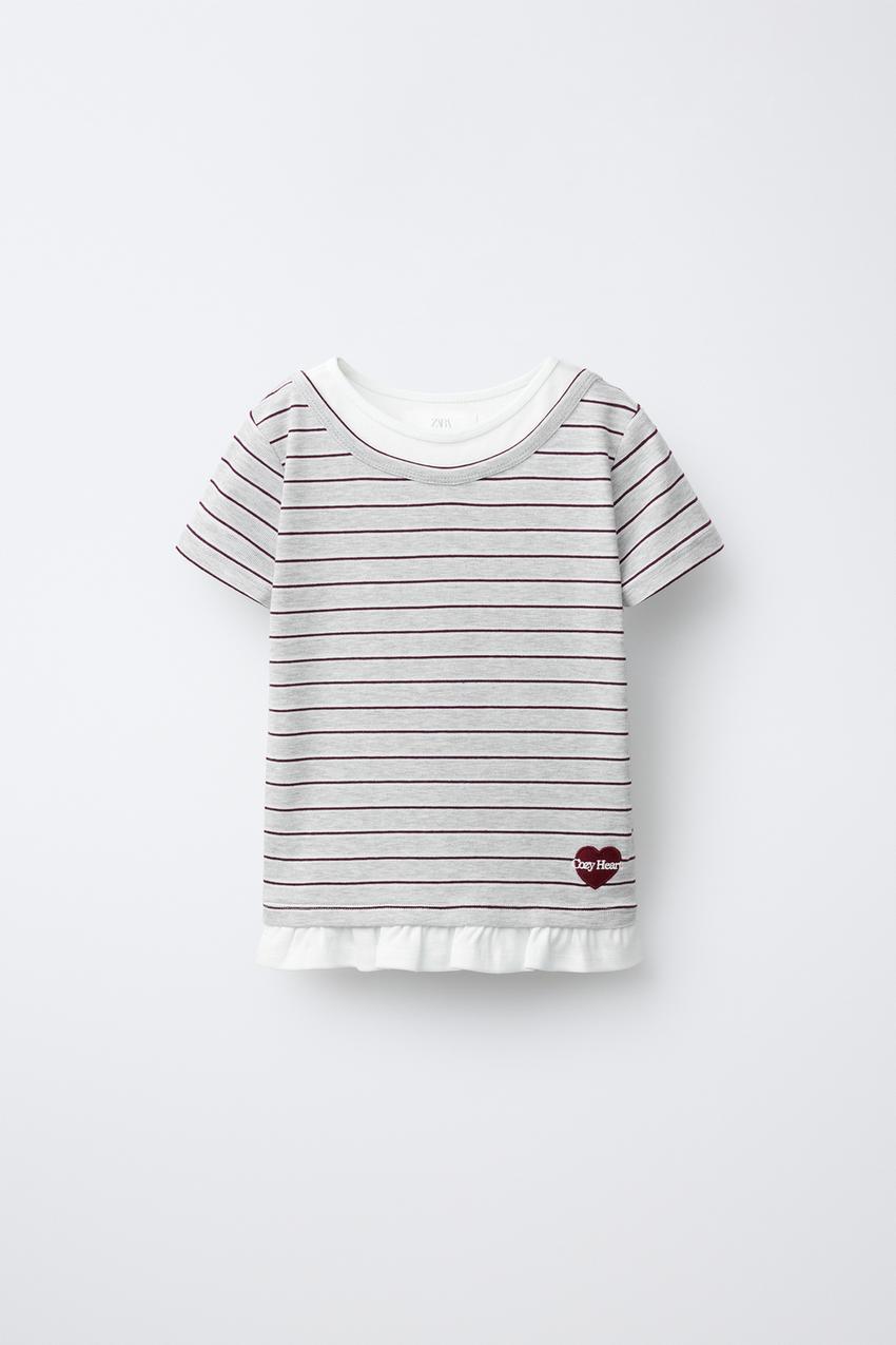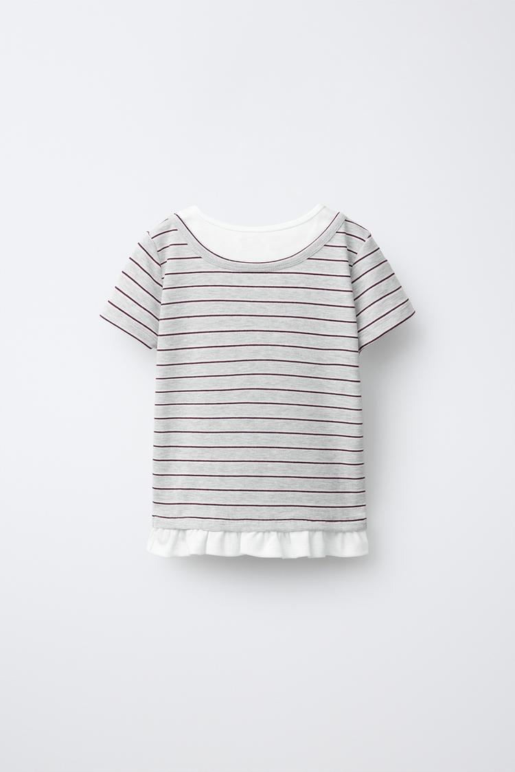 Футболка с двойным воротником и короткими рукавами. Низ с отделкой в виде оборок. Вышивка по низу и полосатый принт.