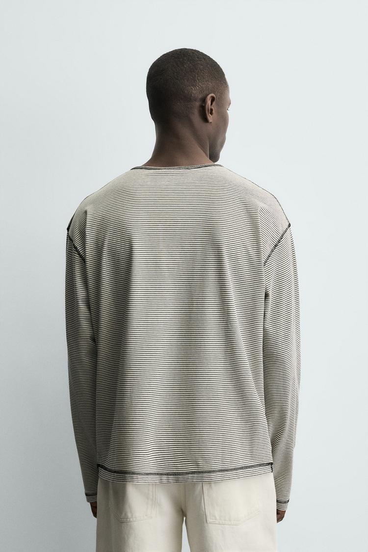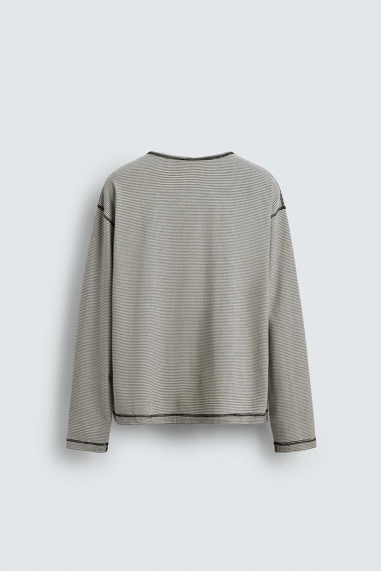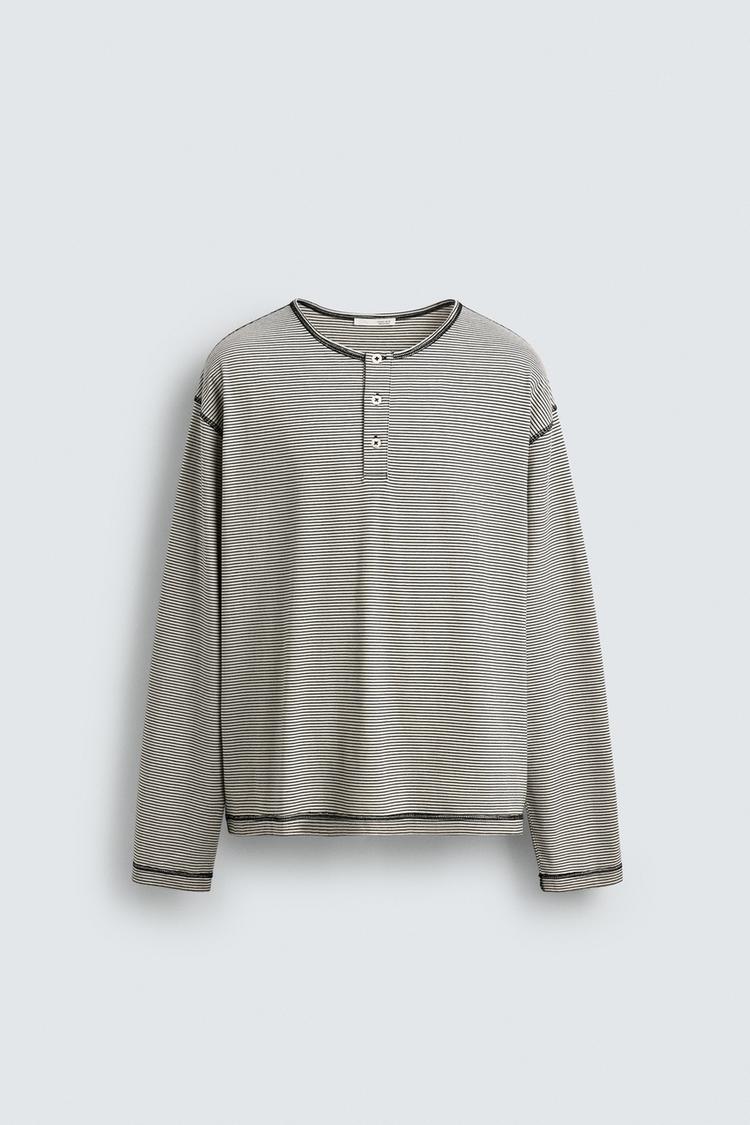 Футболка свободного кроя. Круглый вырез с застежкой на пуговицы спереди. Длинный рукав. Швы обработаны контрастной строчкой.
