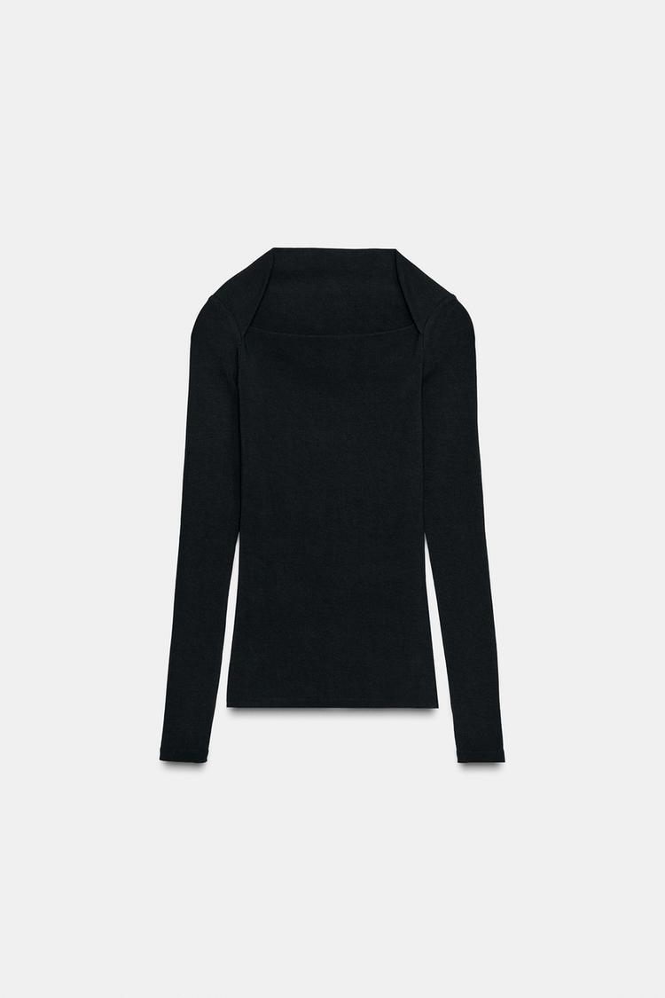 Футболка с квадратным вырезом и длинными рукавами. Ткань в рубчик. Прямой низ.