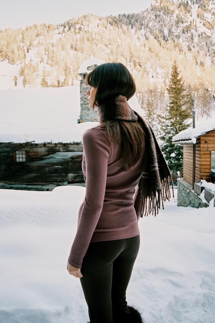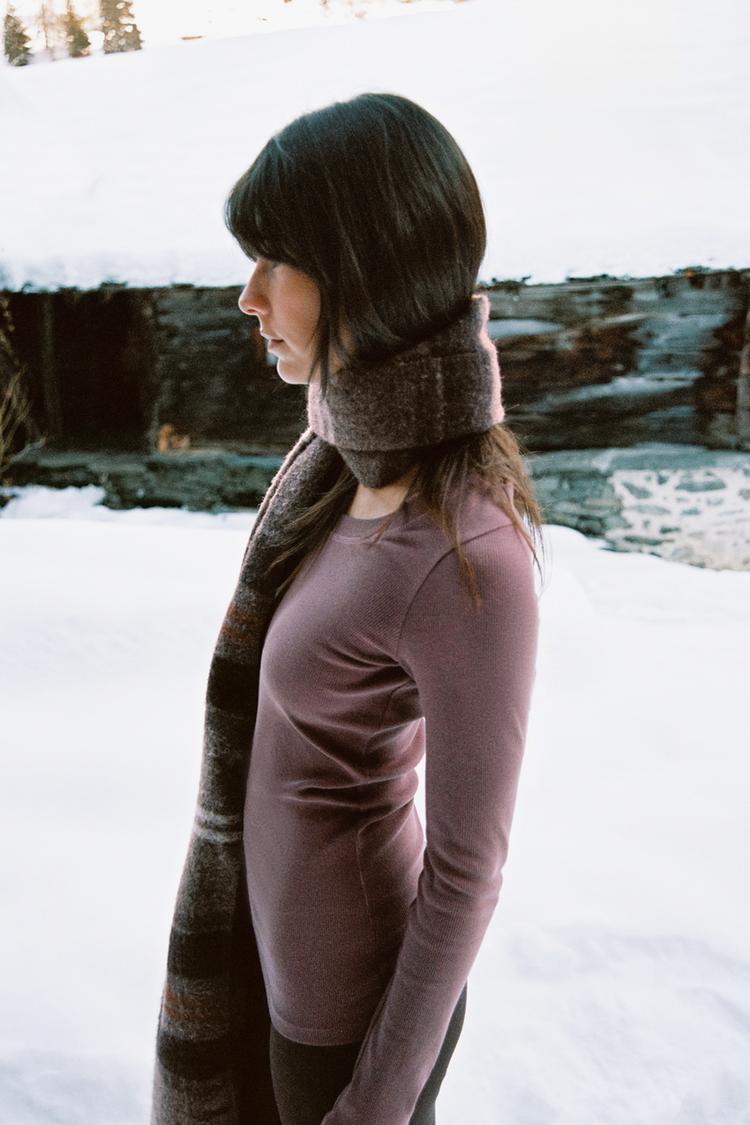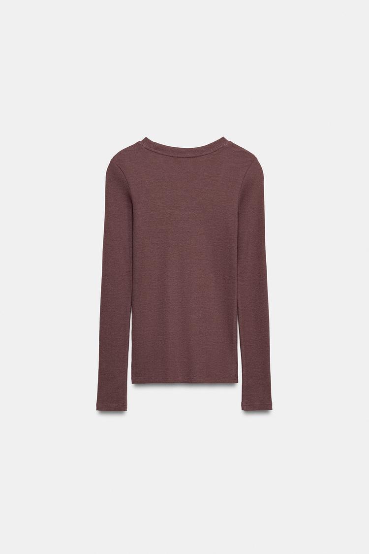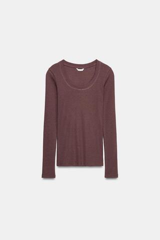 Футболка из хлопковой пряжи. Круглый вырез и длинные рукава. Ткань в рубчик. Прямой низ.